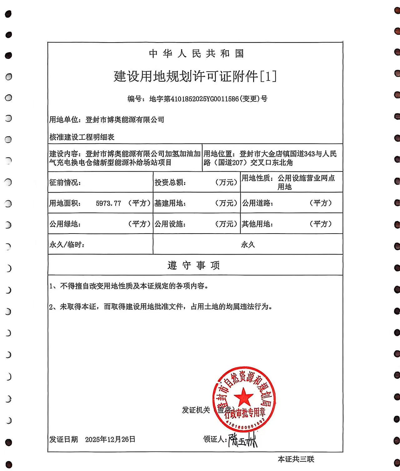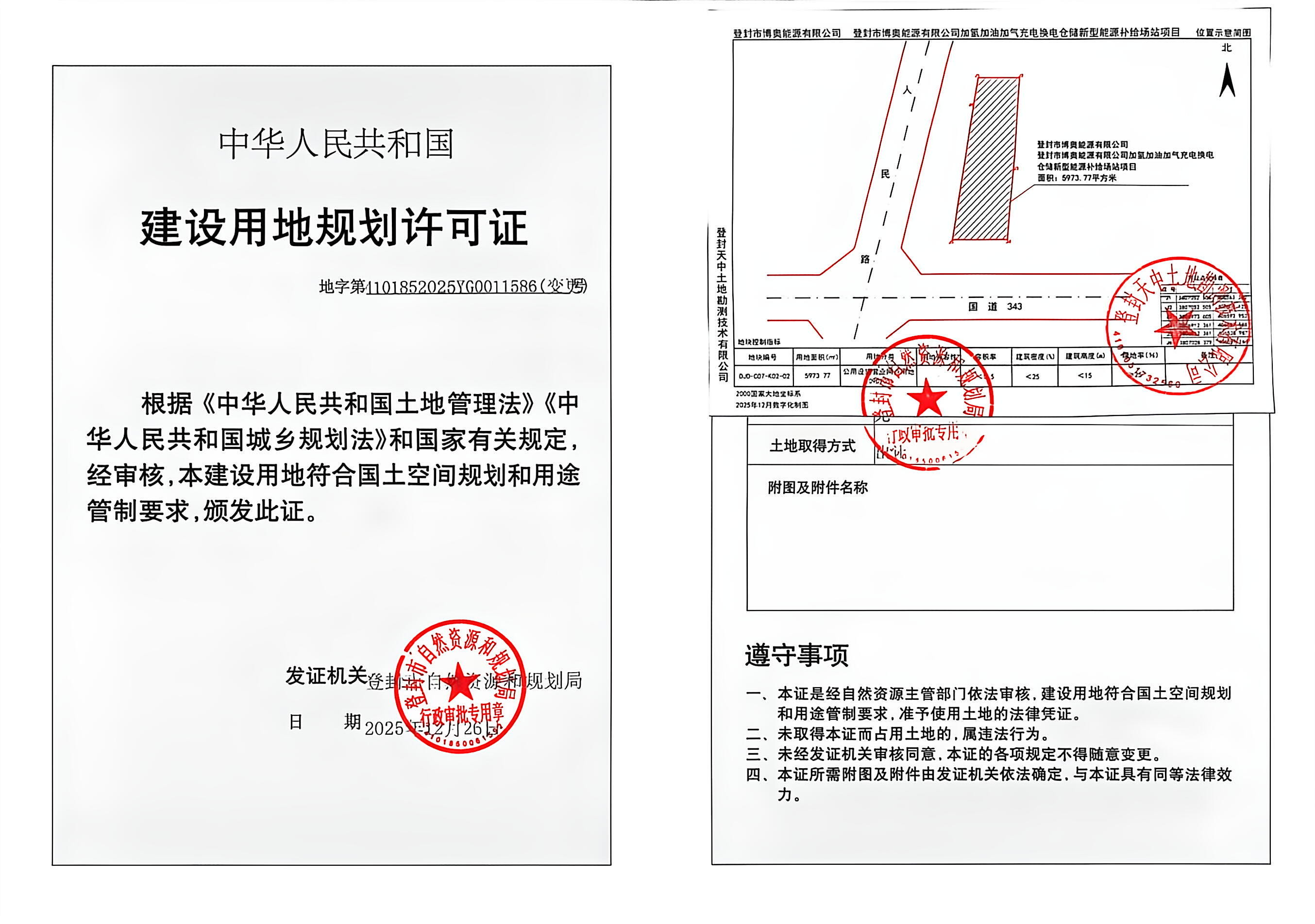登封市自然资源和规划局关于登封市博奥能源有限公司加氢加油加气充电换电仓储新型能源补给场站项目建设用地规划许可证变更的证后公告