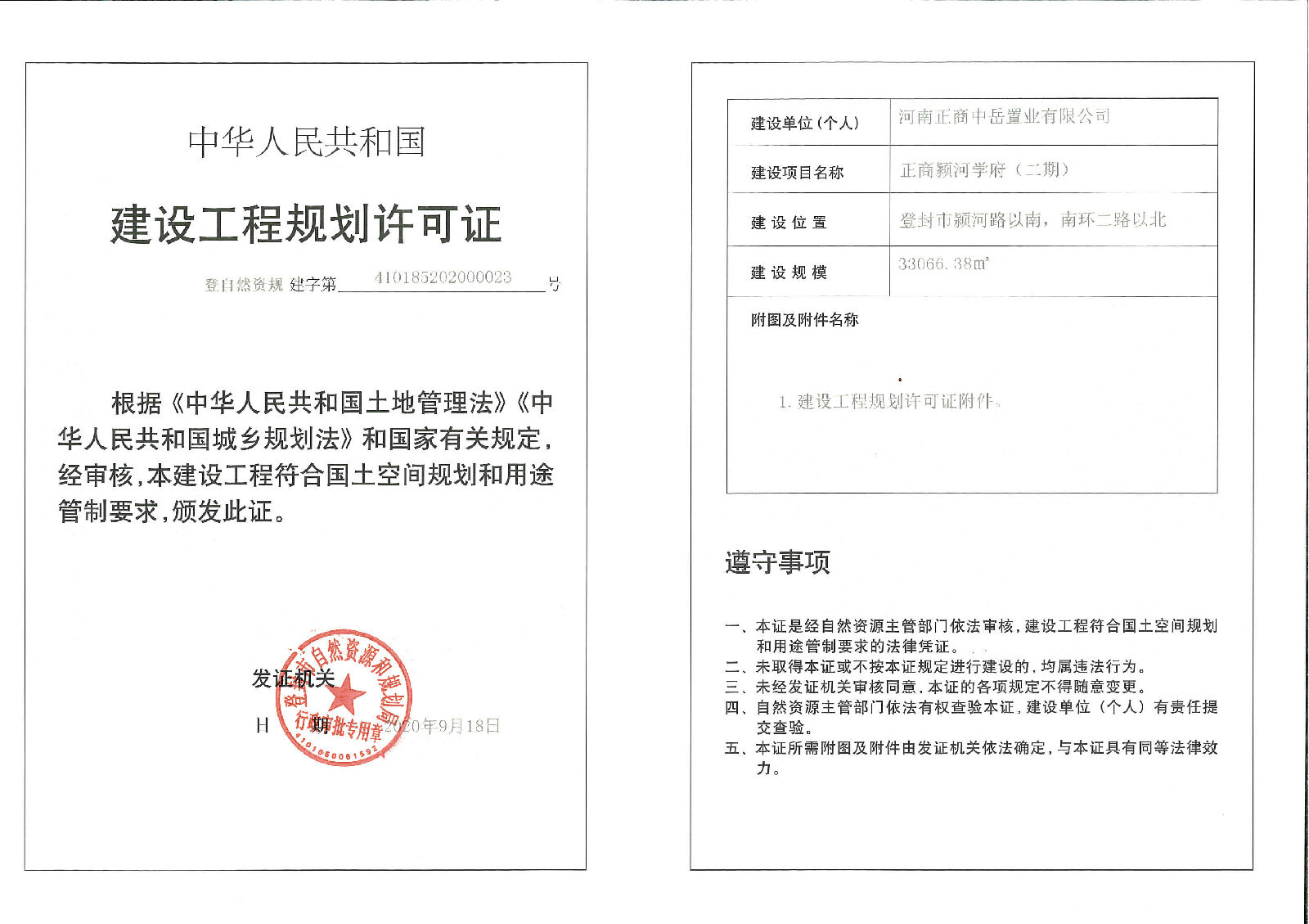 登封市自然资源和规划局关于正商颍河学府(二期)项目建设工程规划许可证批后公告