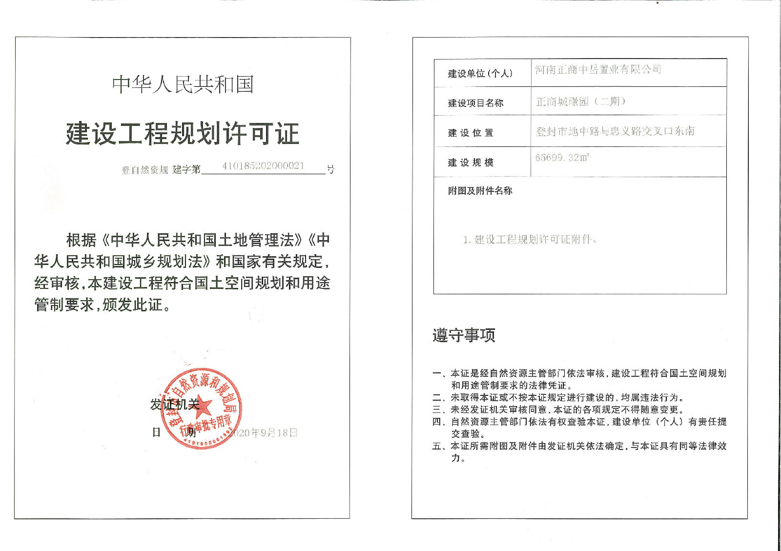 登封市自然资源和规划局关于正商城璟园(二期)项目建设工程规划许可证批后公告