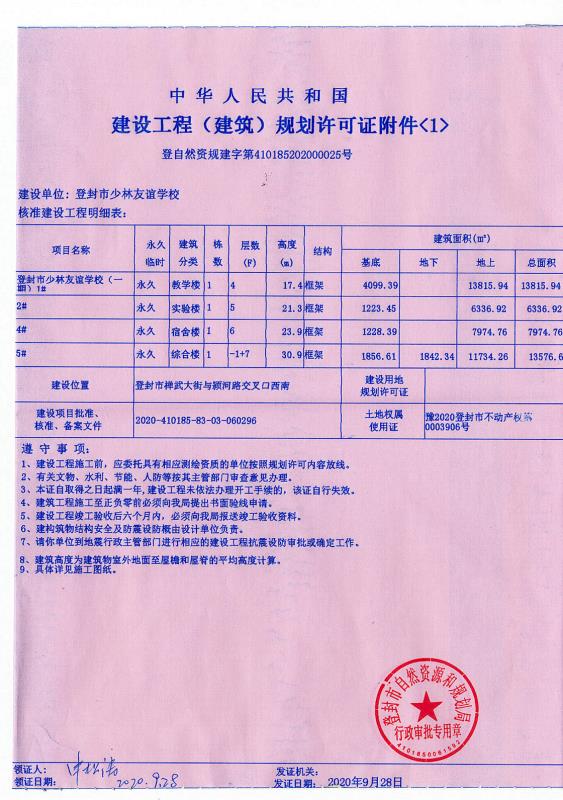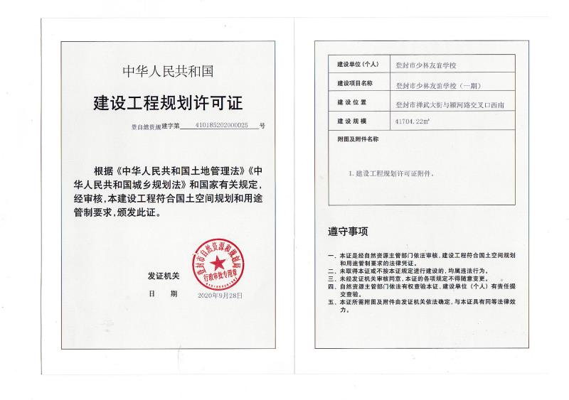登封市自然资源和规划局关于登封市少林友谊学校 登封市少林友谊学校(一期)项目建设工程规划许可证批后公告