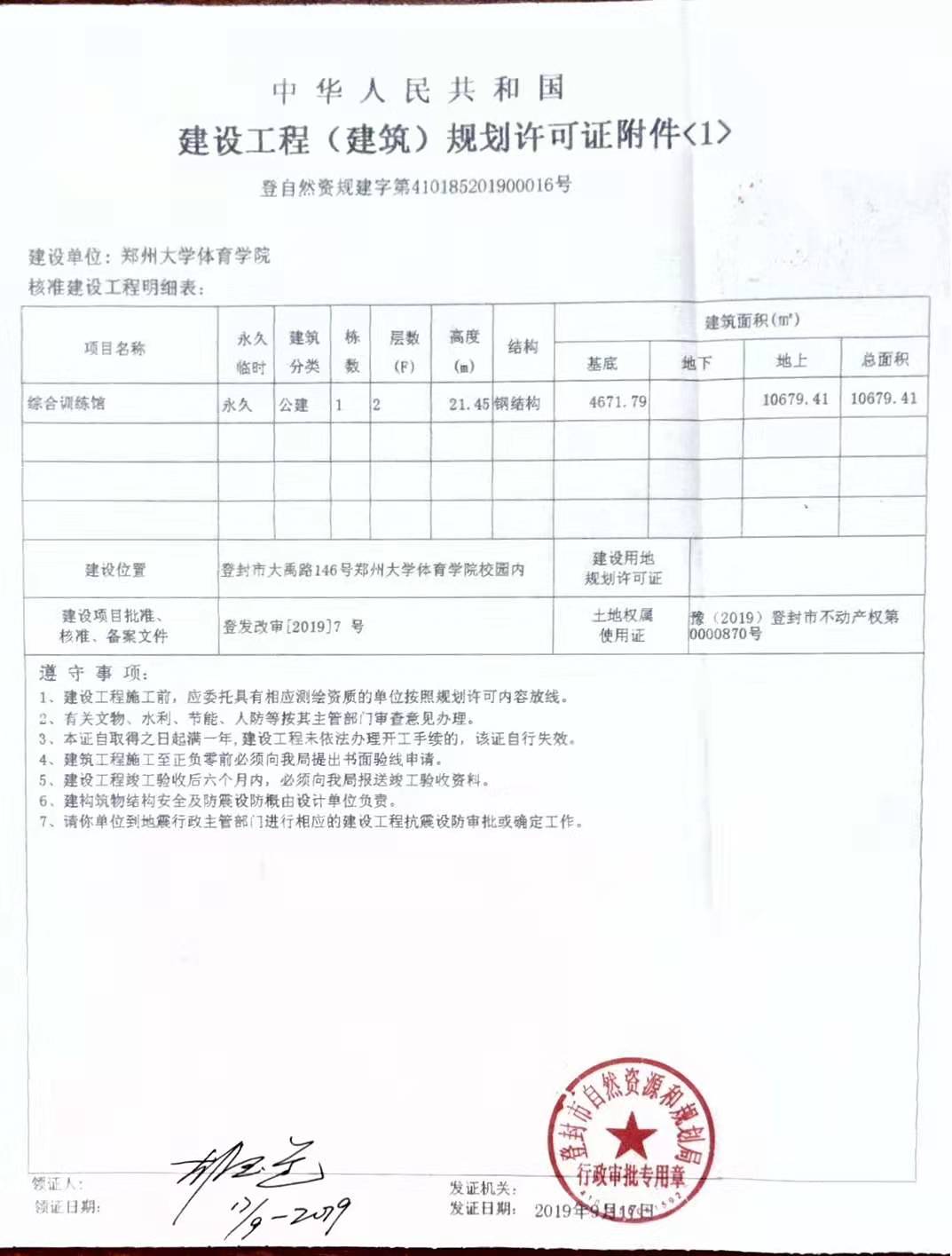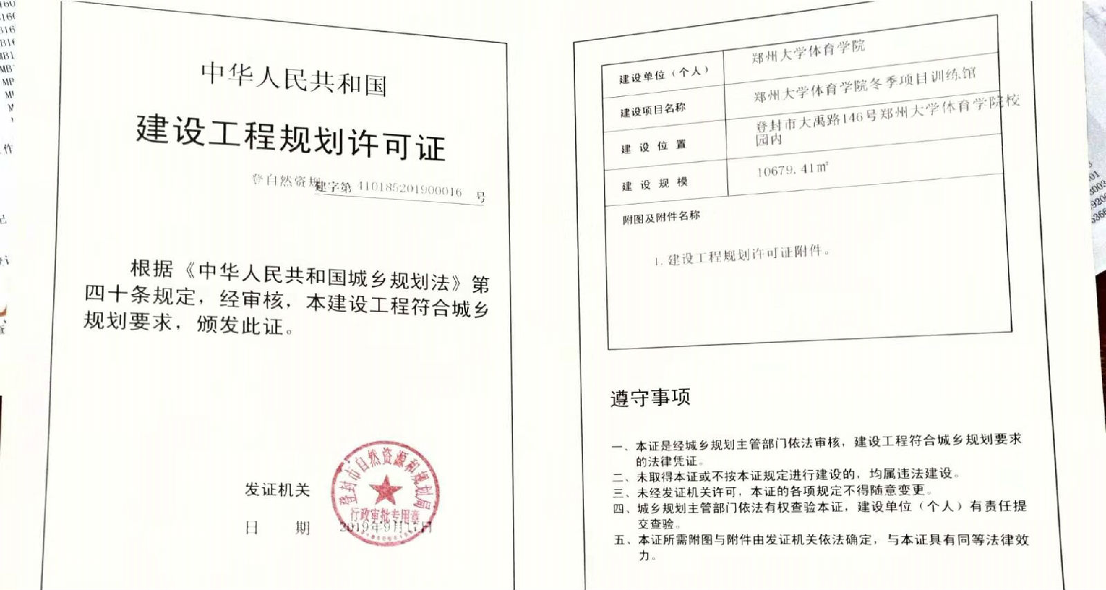 登封市城乡规划局关于郑州大学冬季项目训练馆建设工程规划许可证