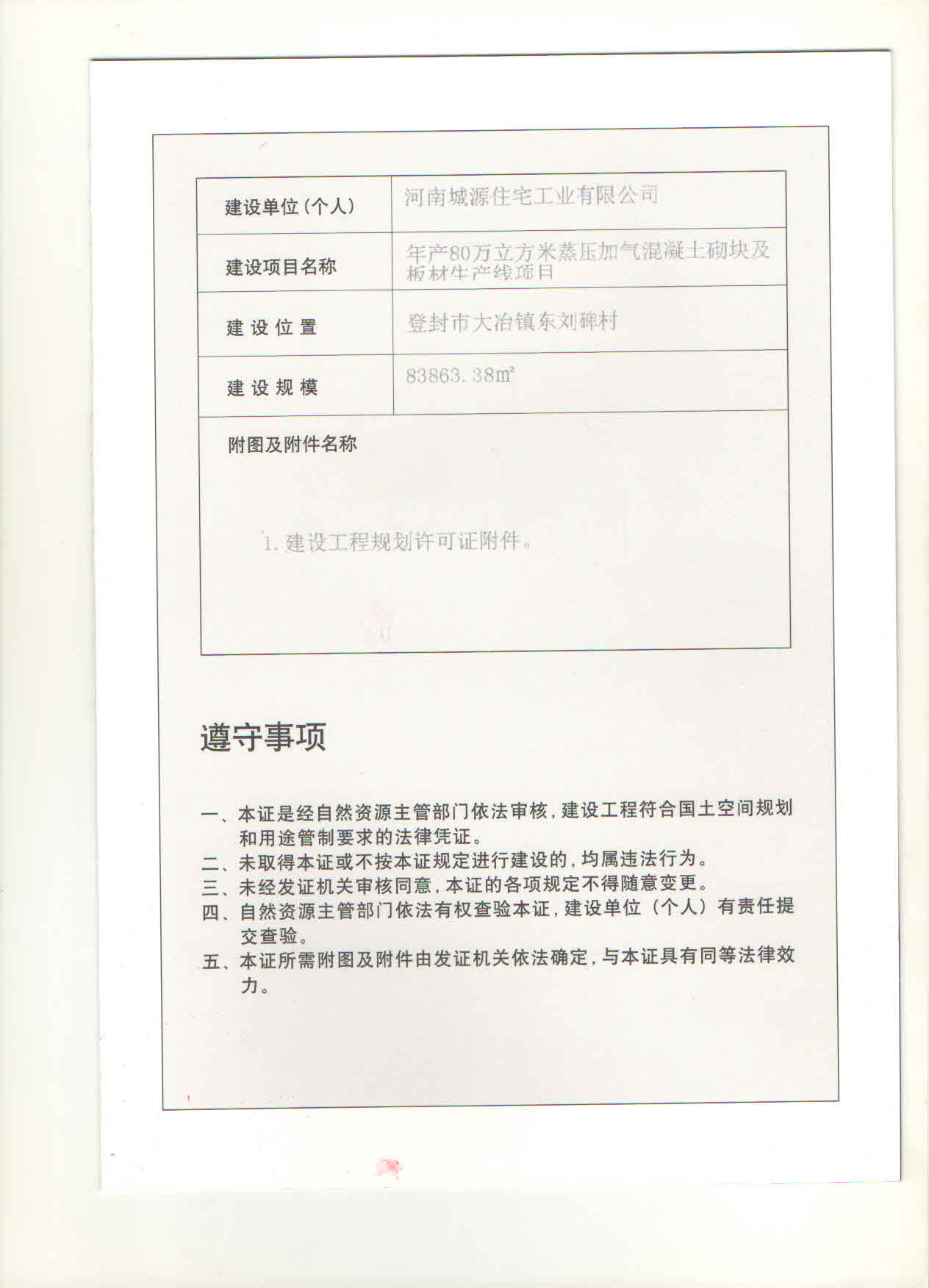 登封市自然资源和规划局关于河南城源住宅工业有限公司 年产80万立方米蒸压加气混凝土砌块及板材生产线项目建设工程规划许可证证后公告