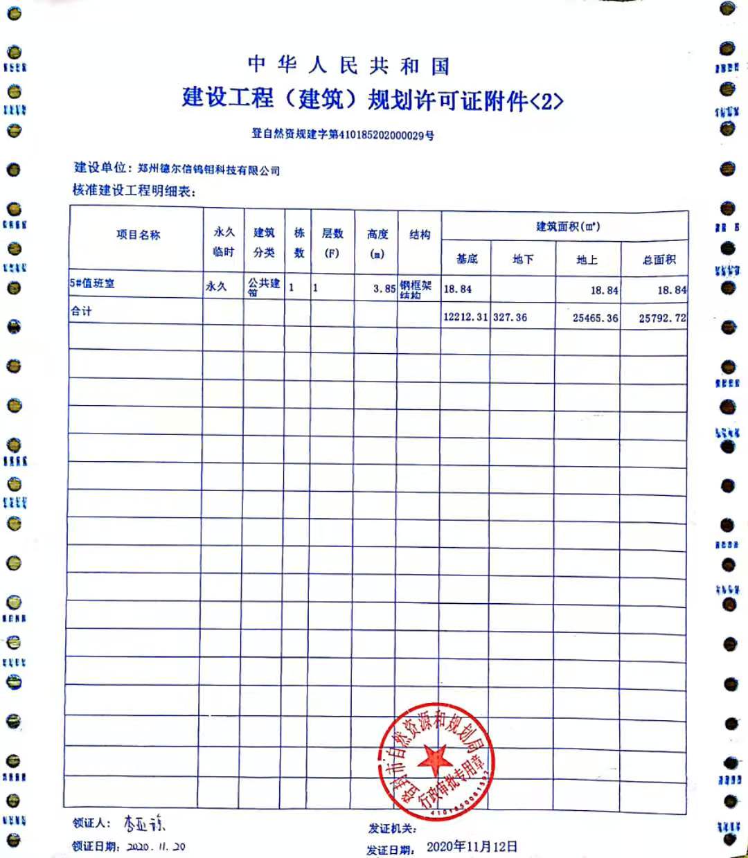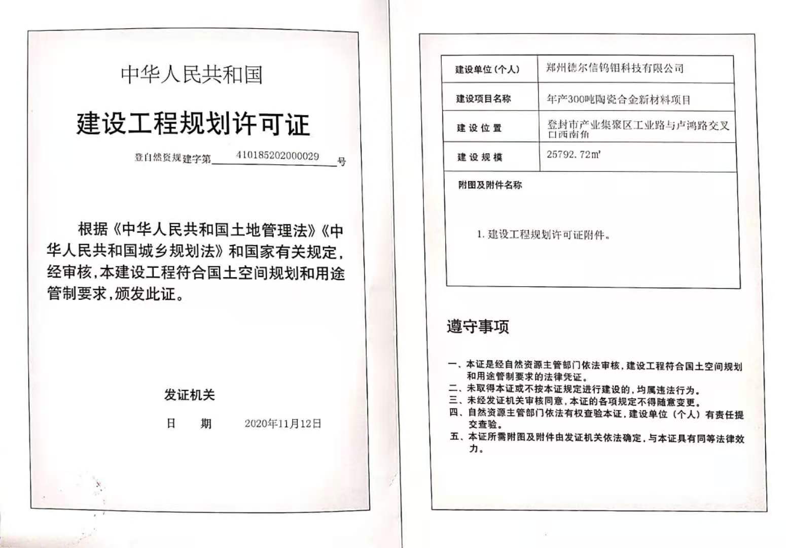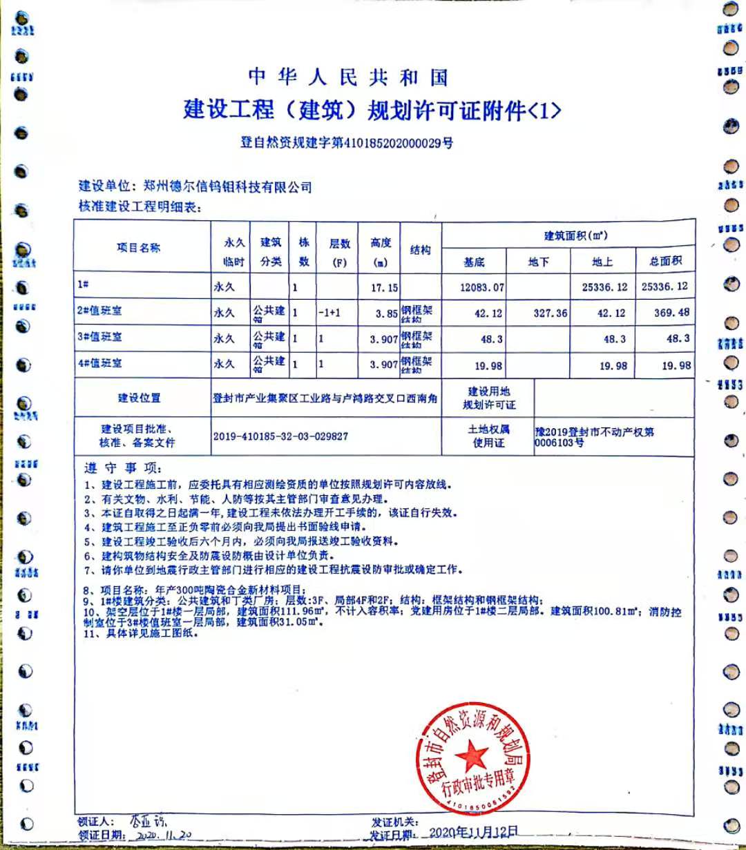 登封市自然资源和规划局关于郑州德尔信钨钼科技有限公司年产300吨陶瓷合金新材料项目建设工程规划许可证证后公告
