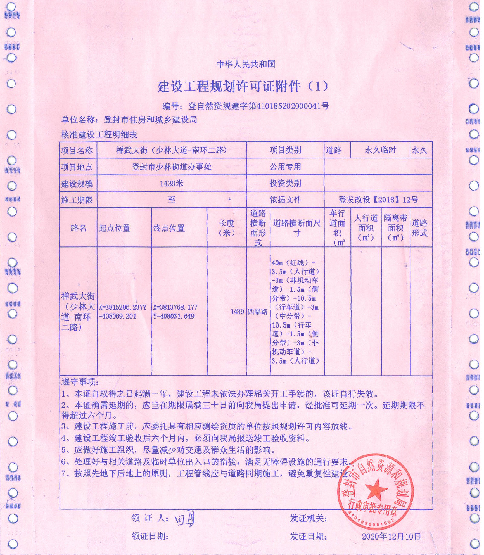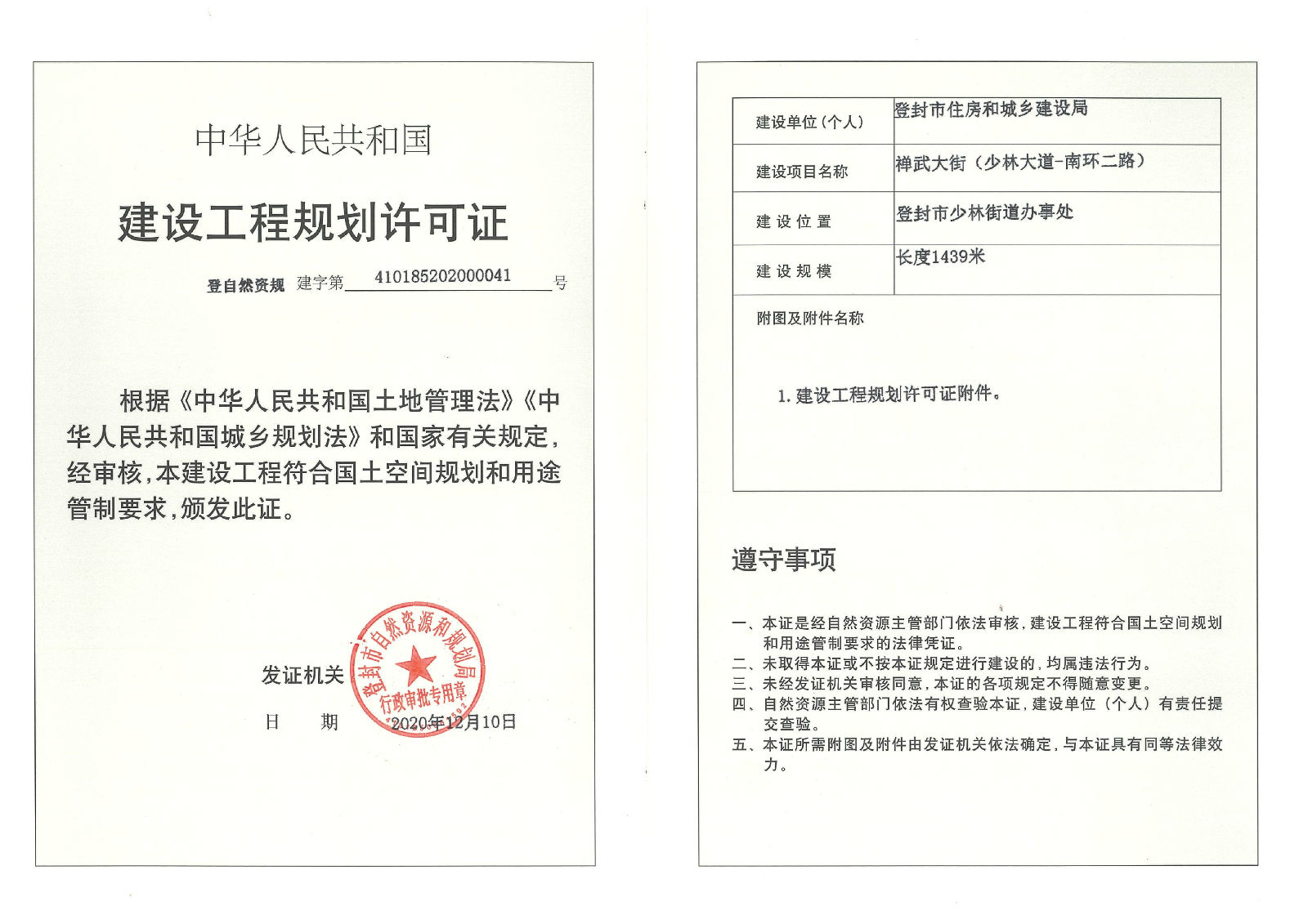 登封市自然资源和规划局关于登封市住房和城乡建设局禅武大街(少林大道--南环二路)建设工程规划许可证证后公告