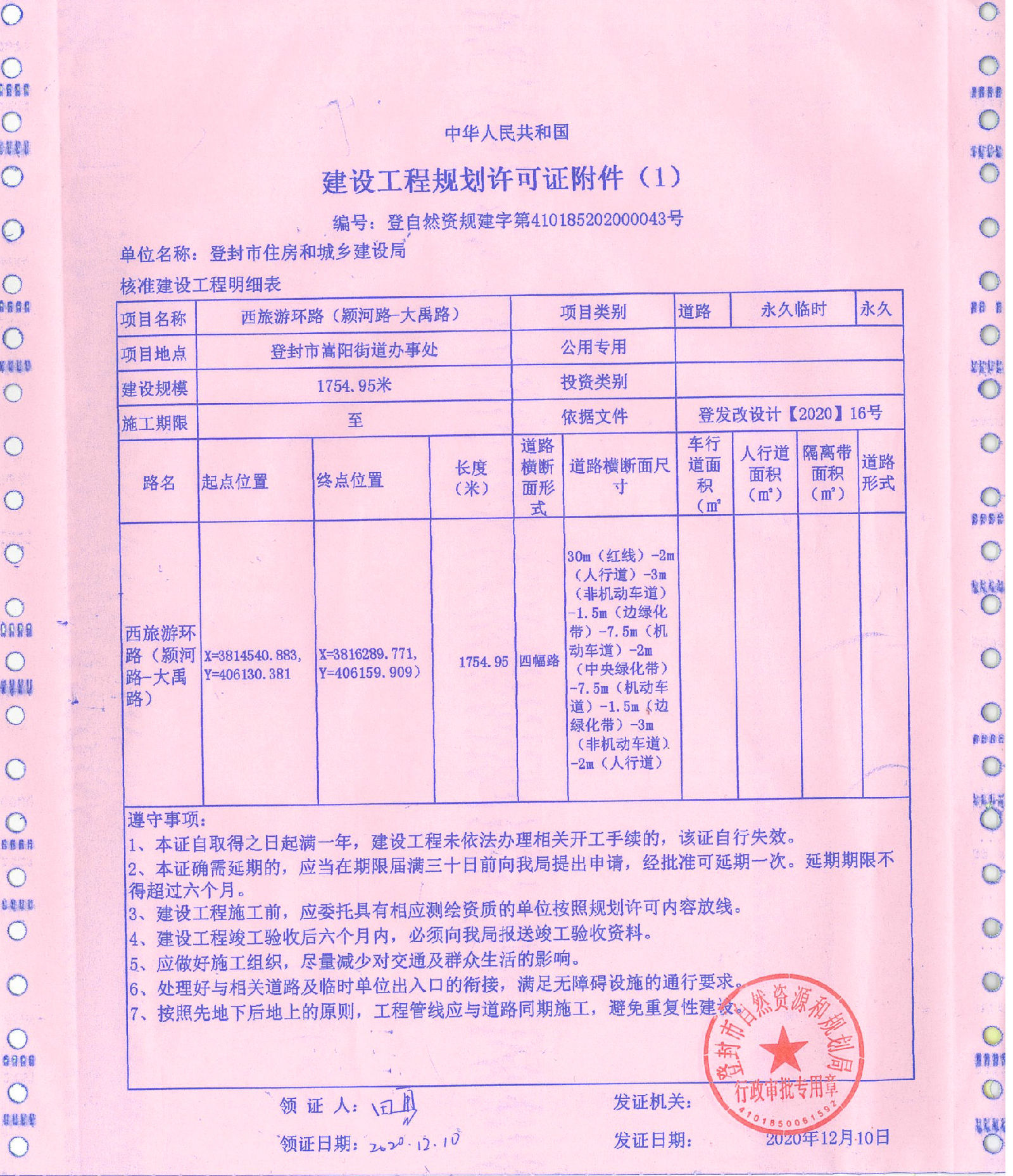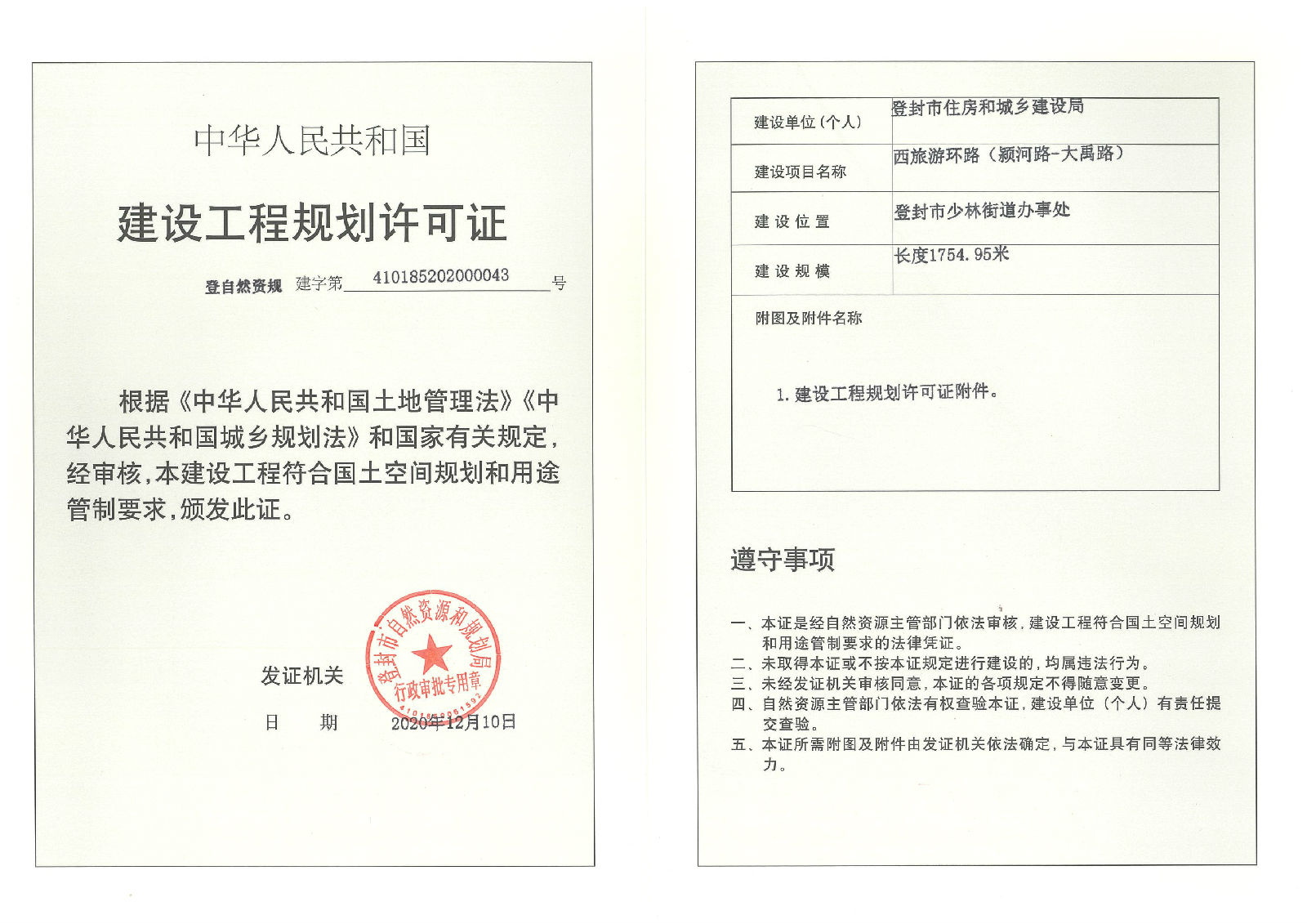 登封市自然资源和规划局关于登封市住房和城乡建设局西旅游环路(颍河路--大禹路路)建设工程规划许可证证后公告
