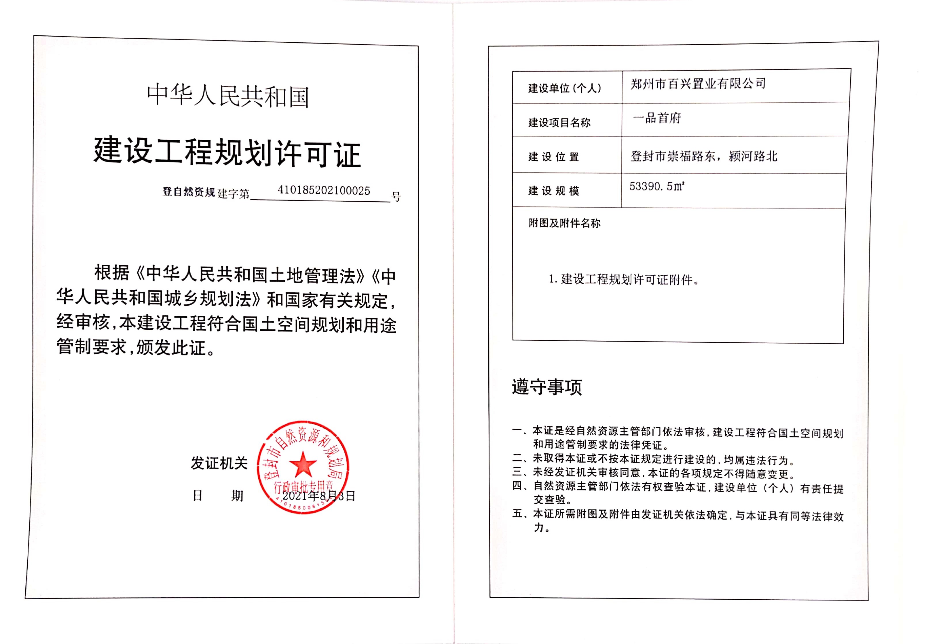 登封市自然资源和规划局关于一品首府项目建设工程规划许可证证后公告