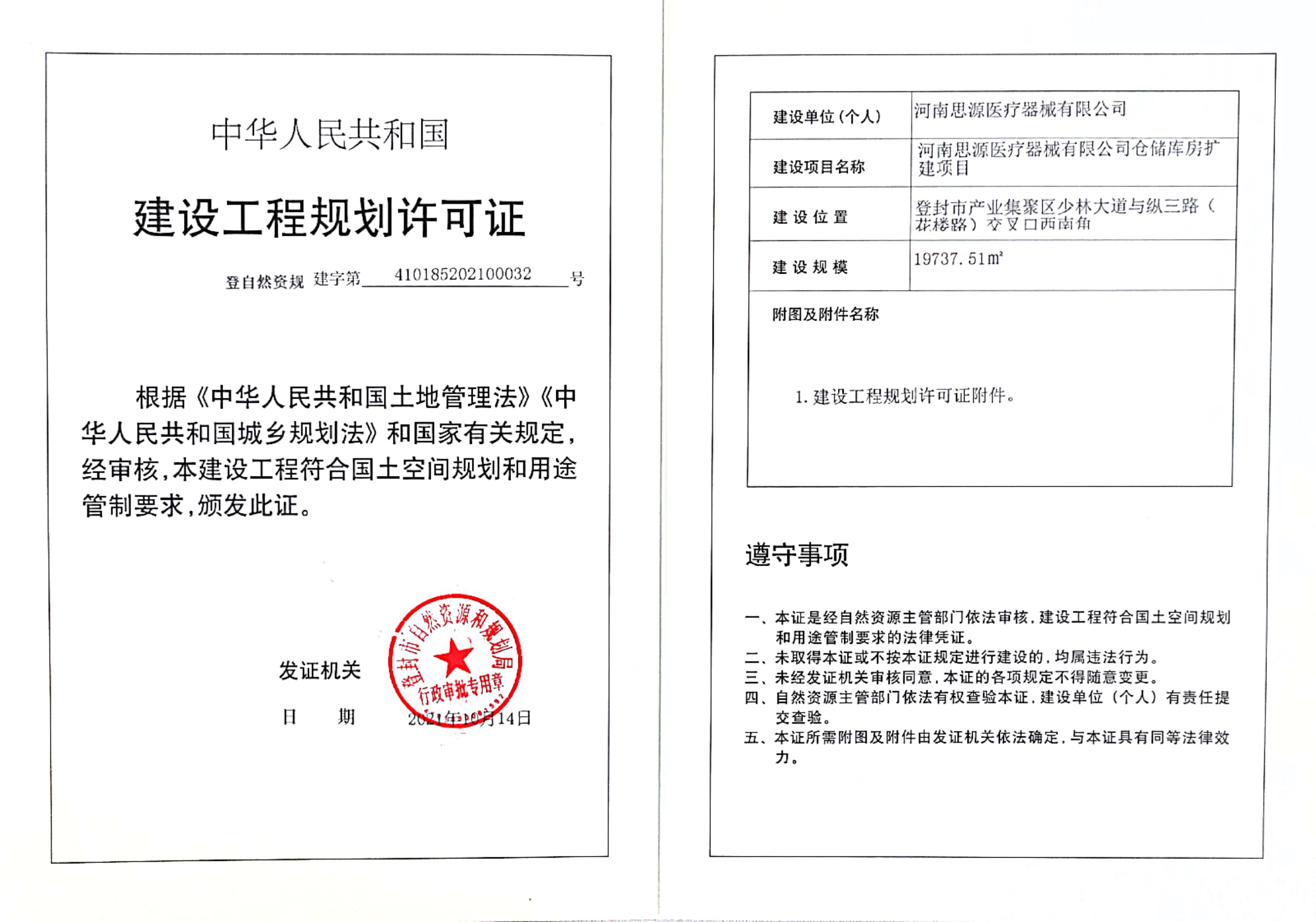 登封市自然资源和规划局关于河南思源医疗器械有限公司仓储库房扩建项目建设工程规划许可证证后公告