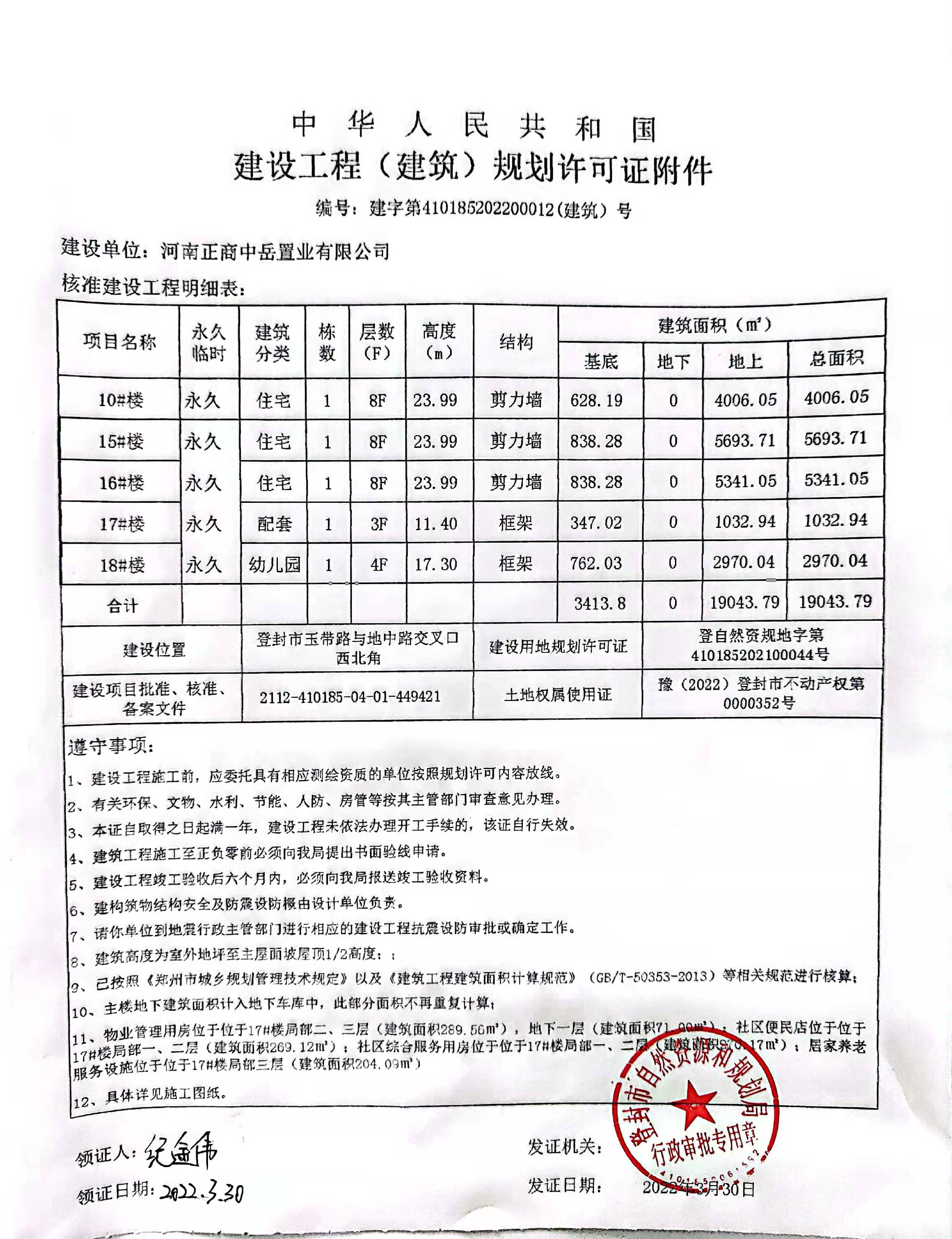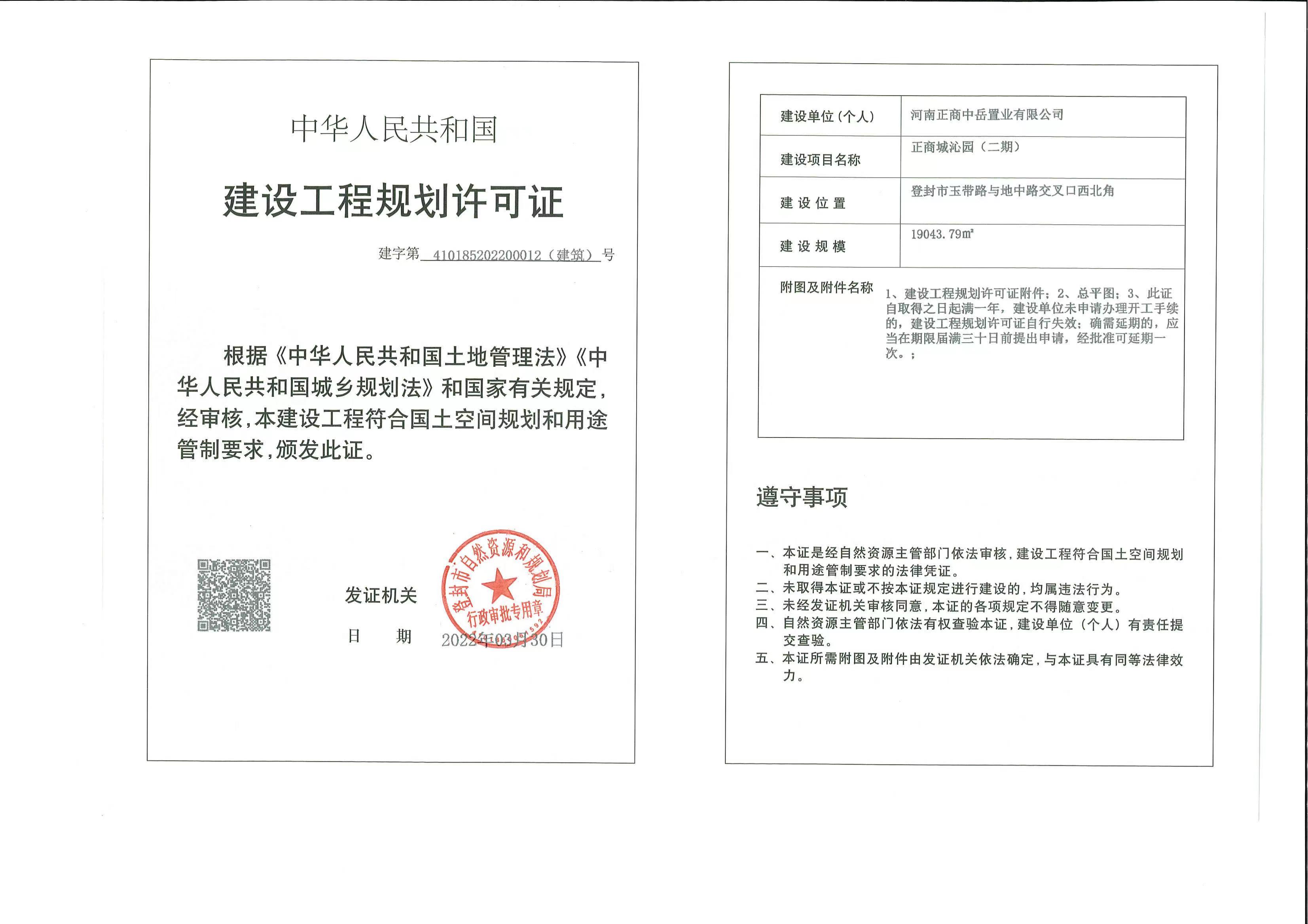 登封市自然资源和规划局关于正商城沁园(二期)项目建设工程规划许可证证后公告