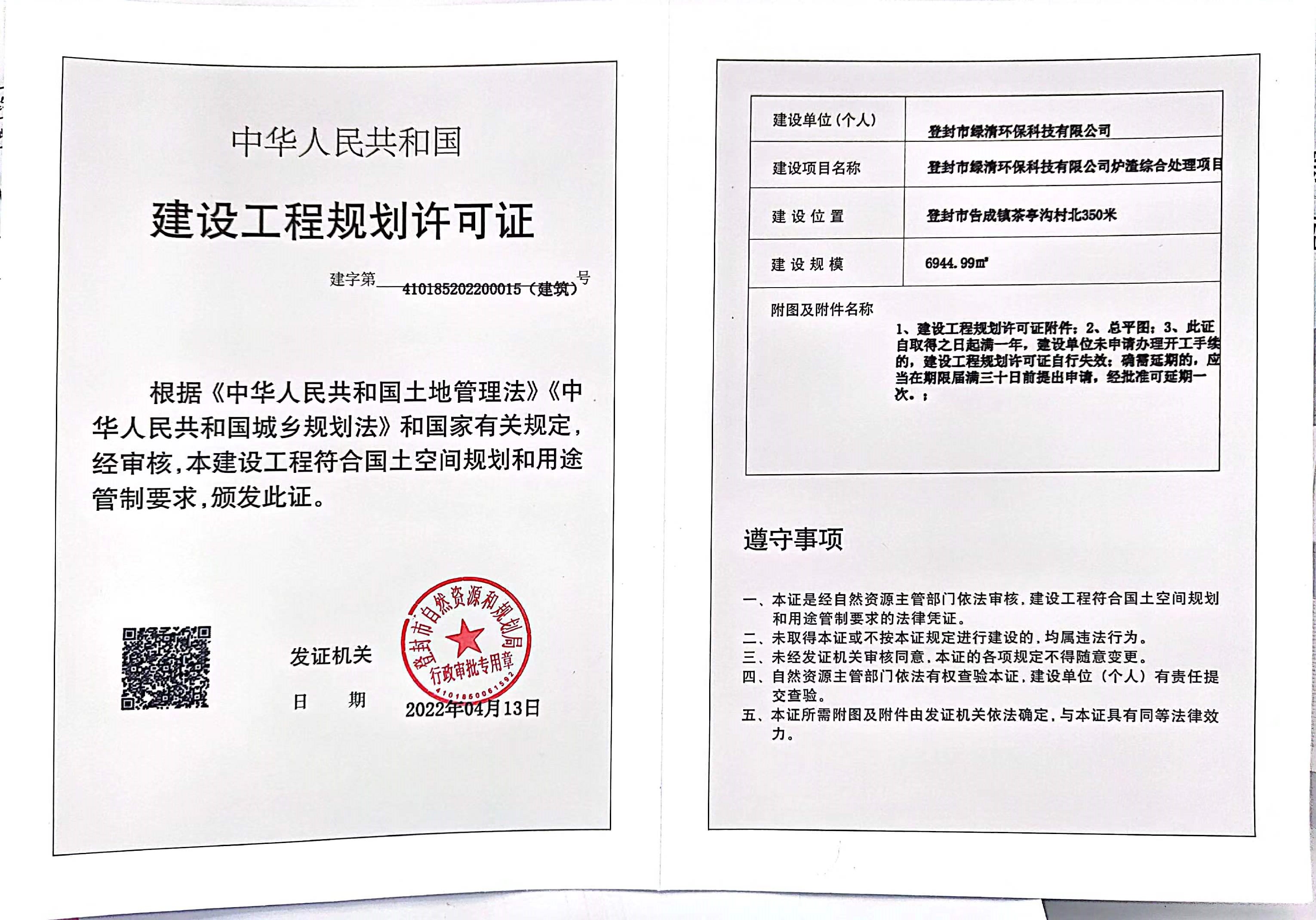 登封市自然资源和规划局关于登封市绿清环保科技有限公司炉渣综合处理项目建设工程规划许可证证后公告