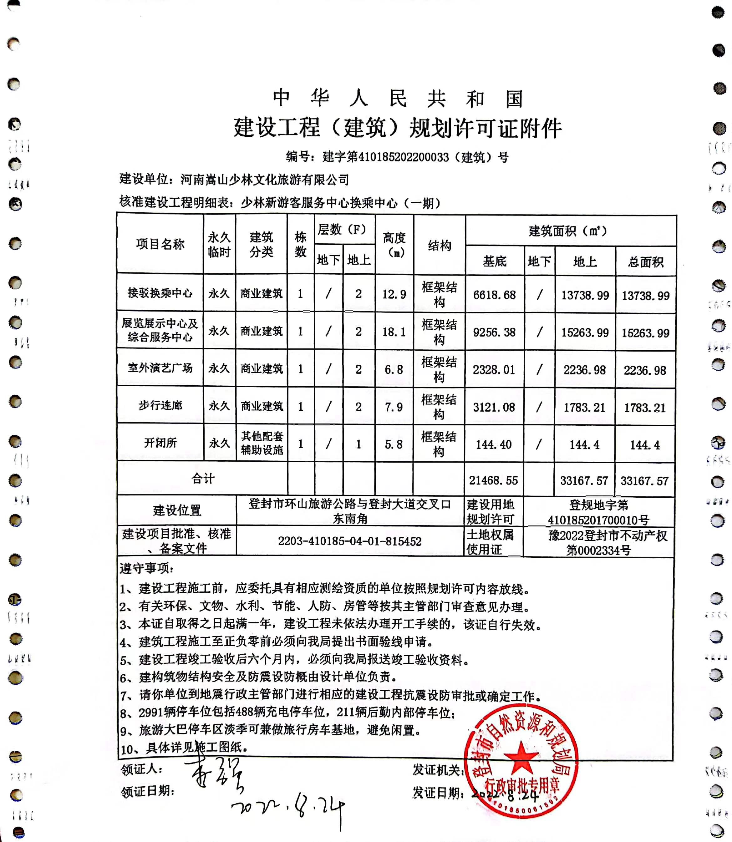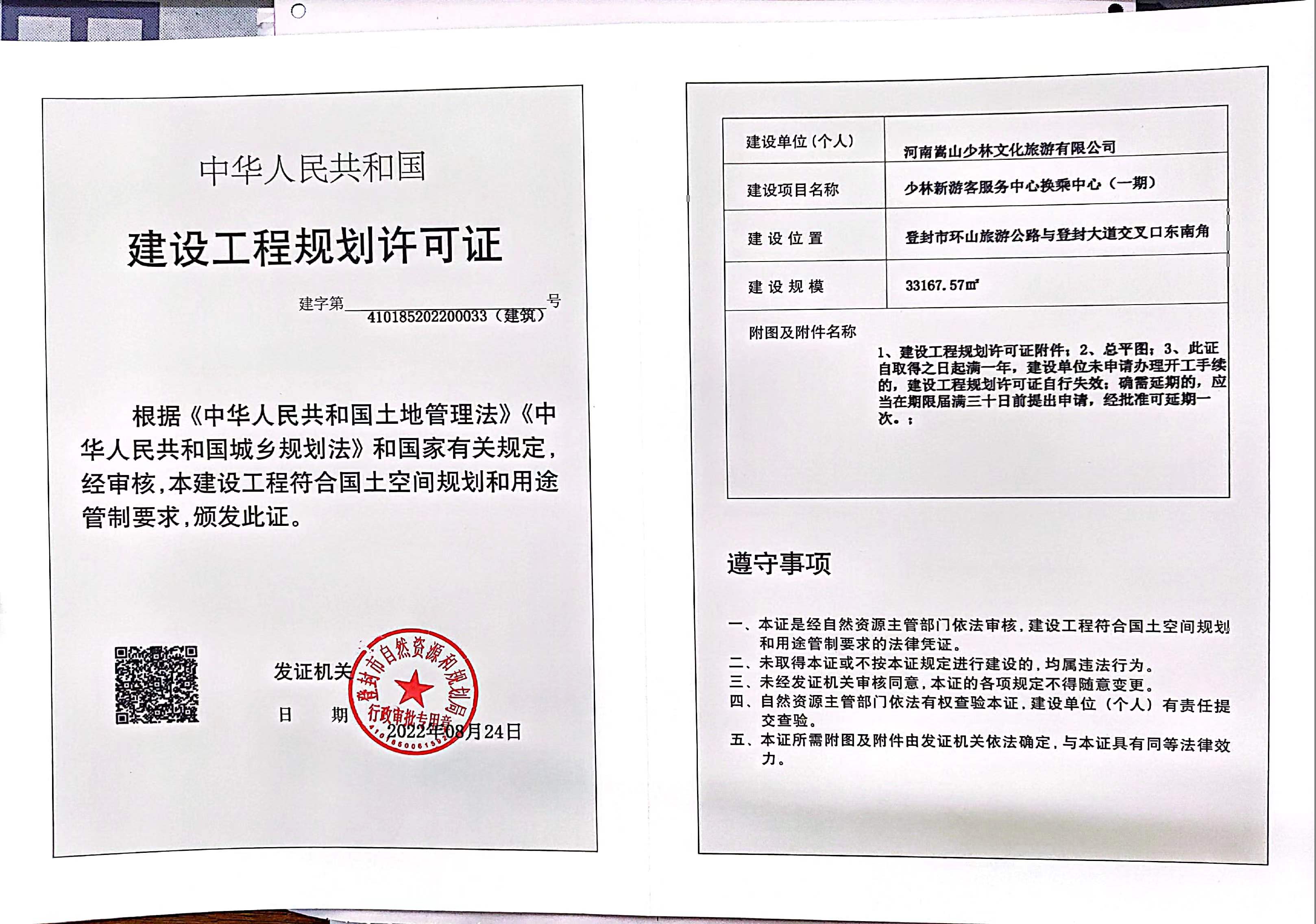 登封市自然资源和规划局关于少林新游客服务中心换乘中心(一期)项目建设工程规划许可证的证后公告