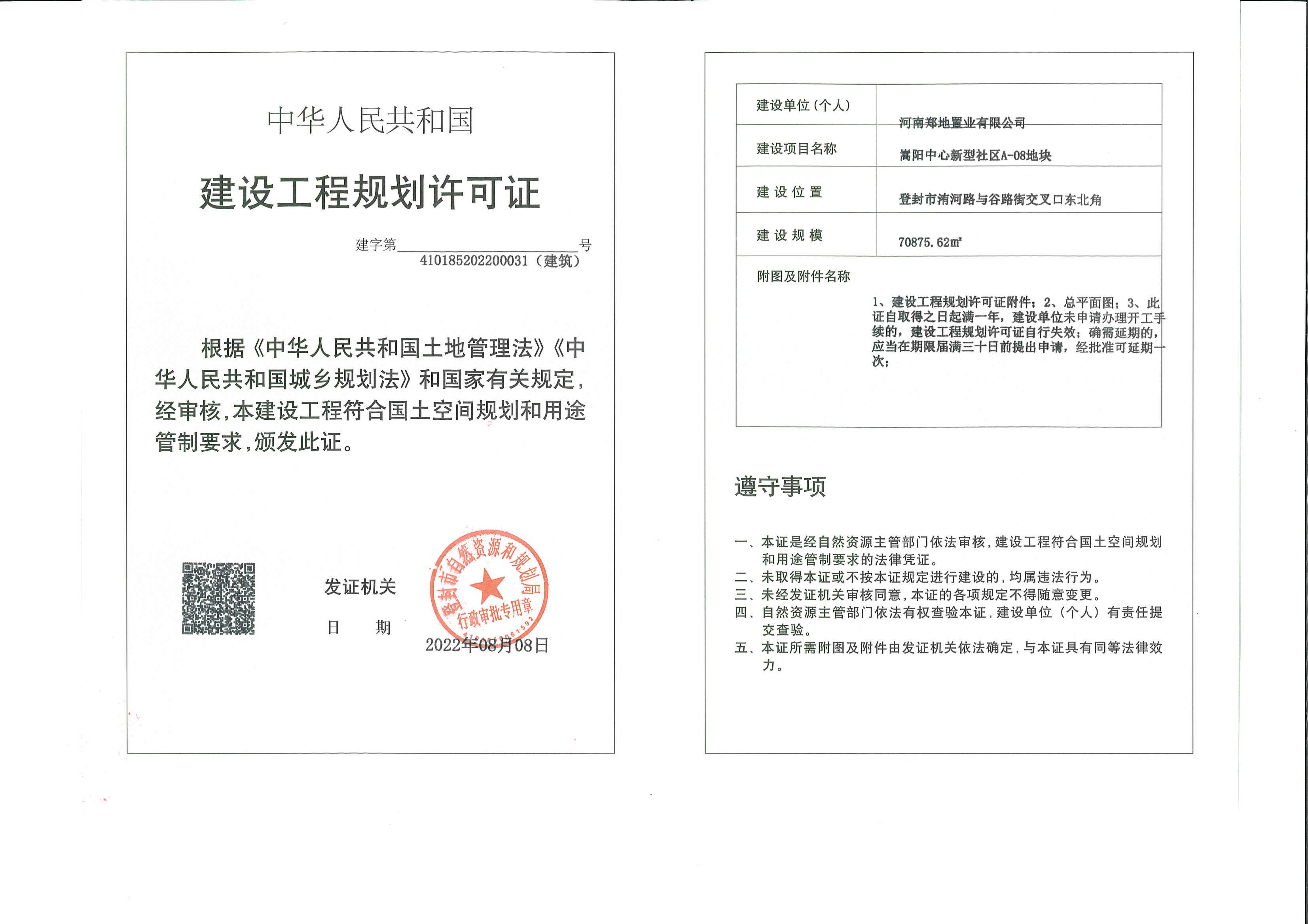 登封市自然资源和规划局关于嵩阳中心新型社区A-08地块项目建设工程规划许可证的证后公告