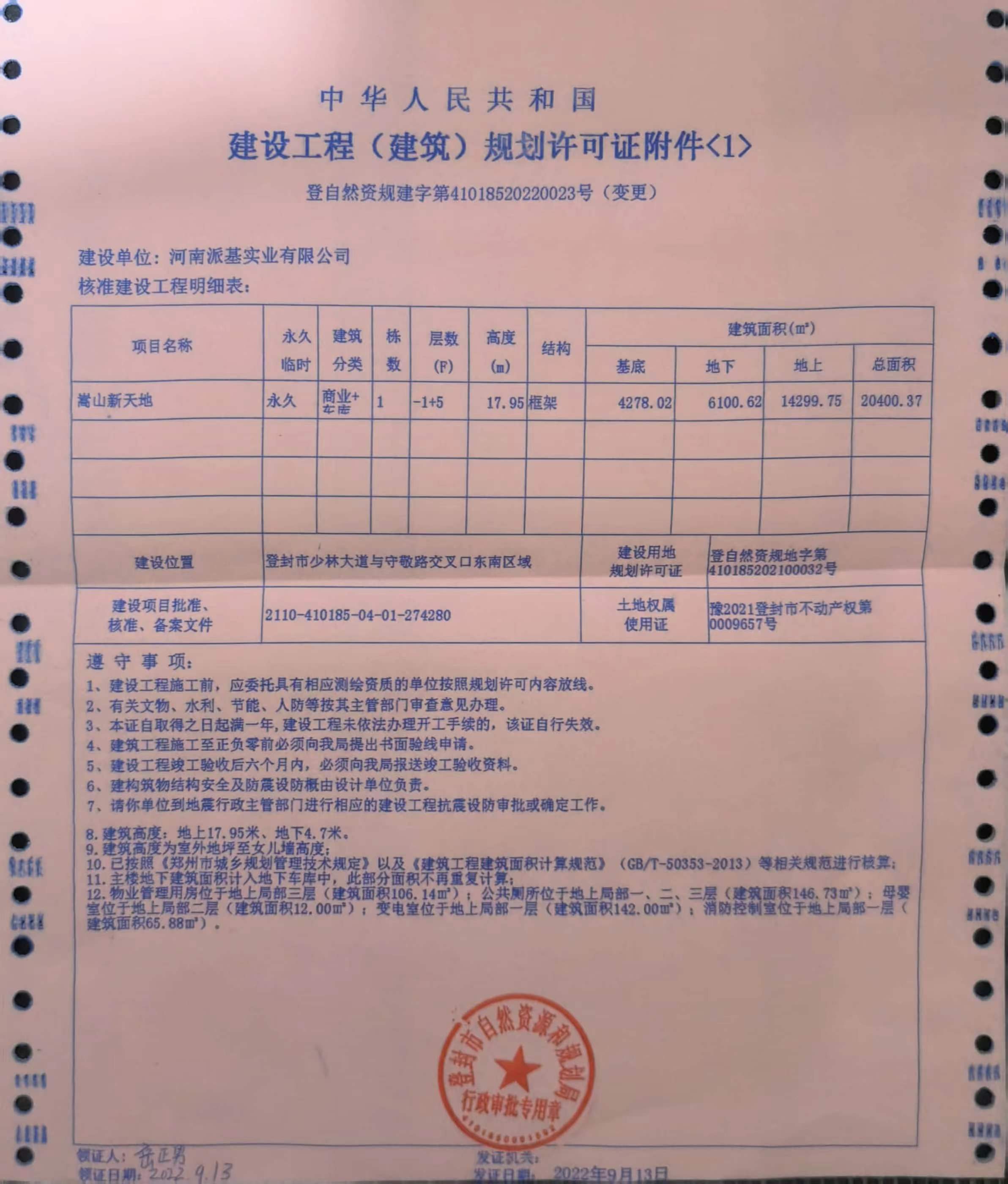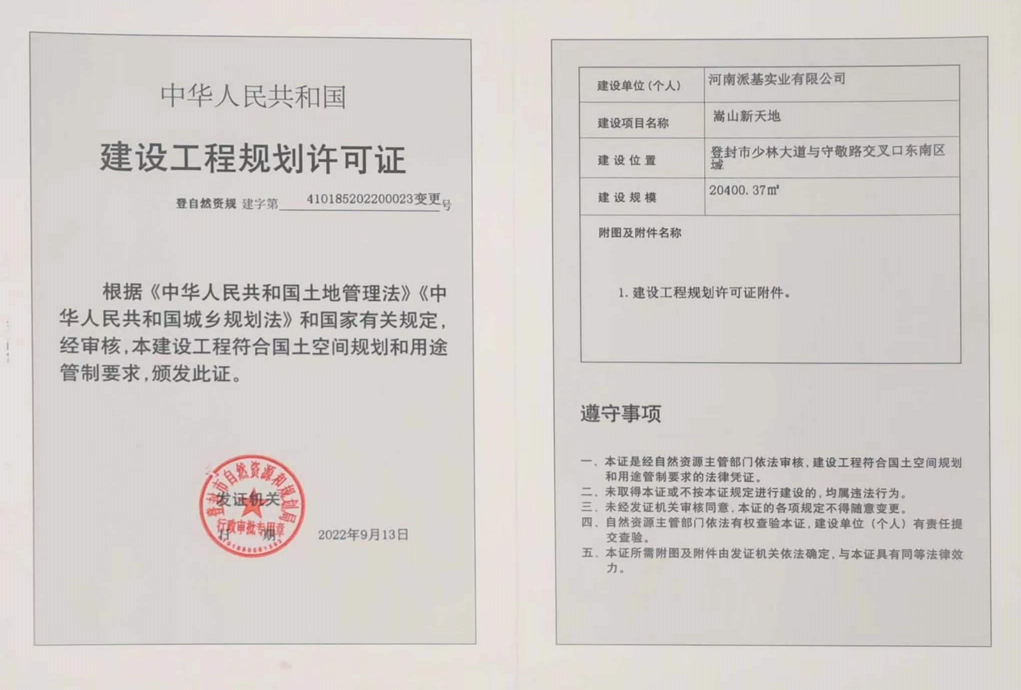 登封市自然资源和规划局关于嵩山新天地项目建设工程规划许可证变更的证后公告