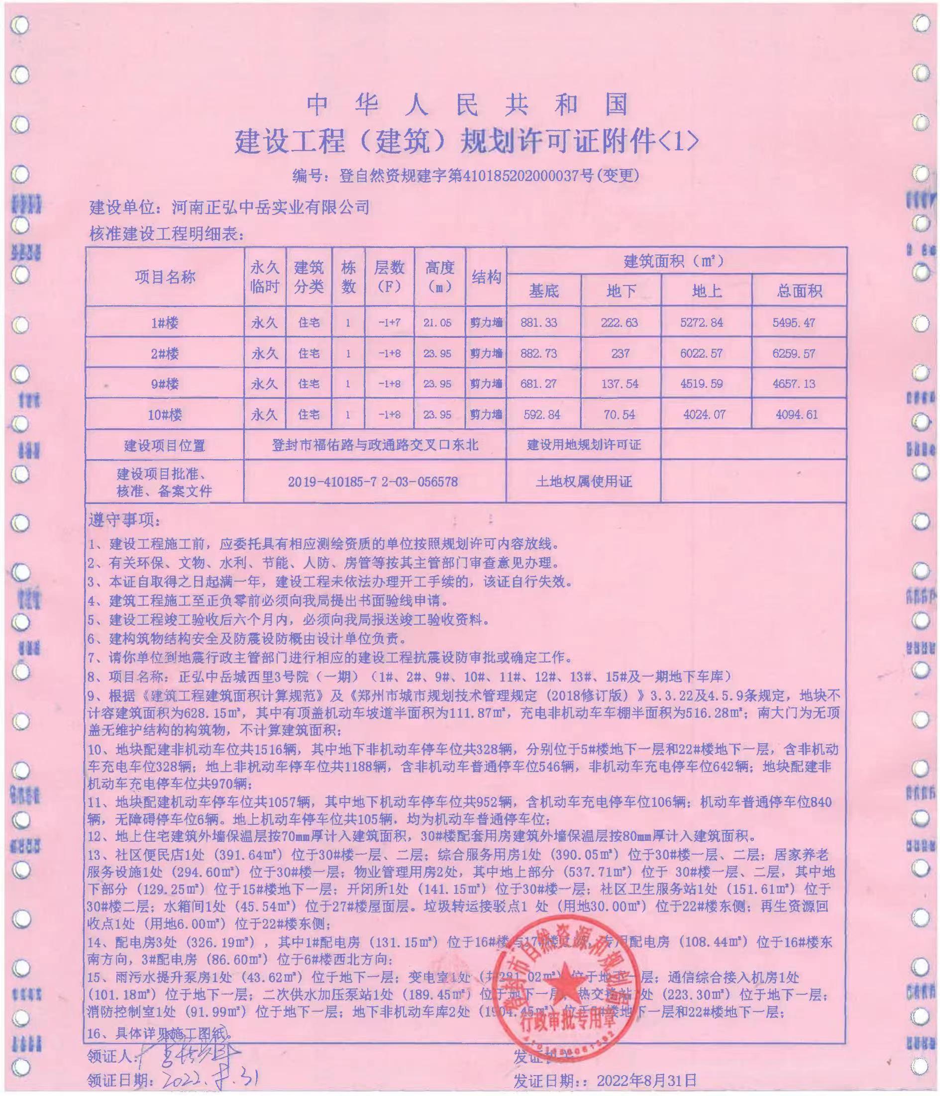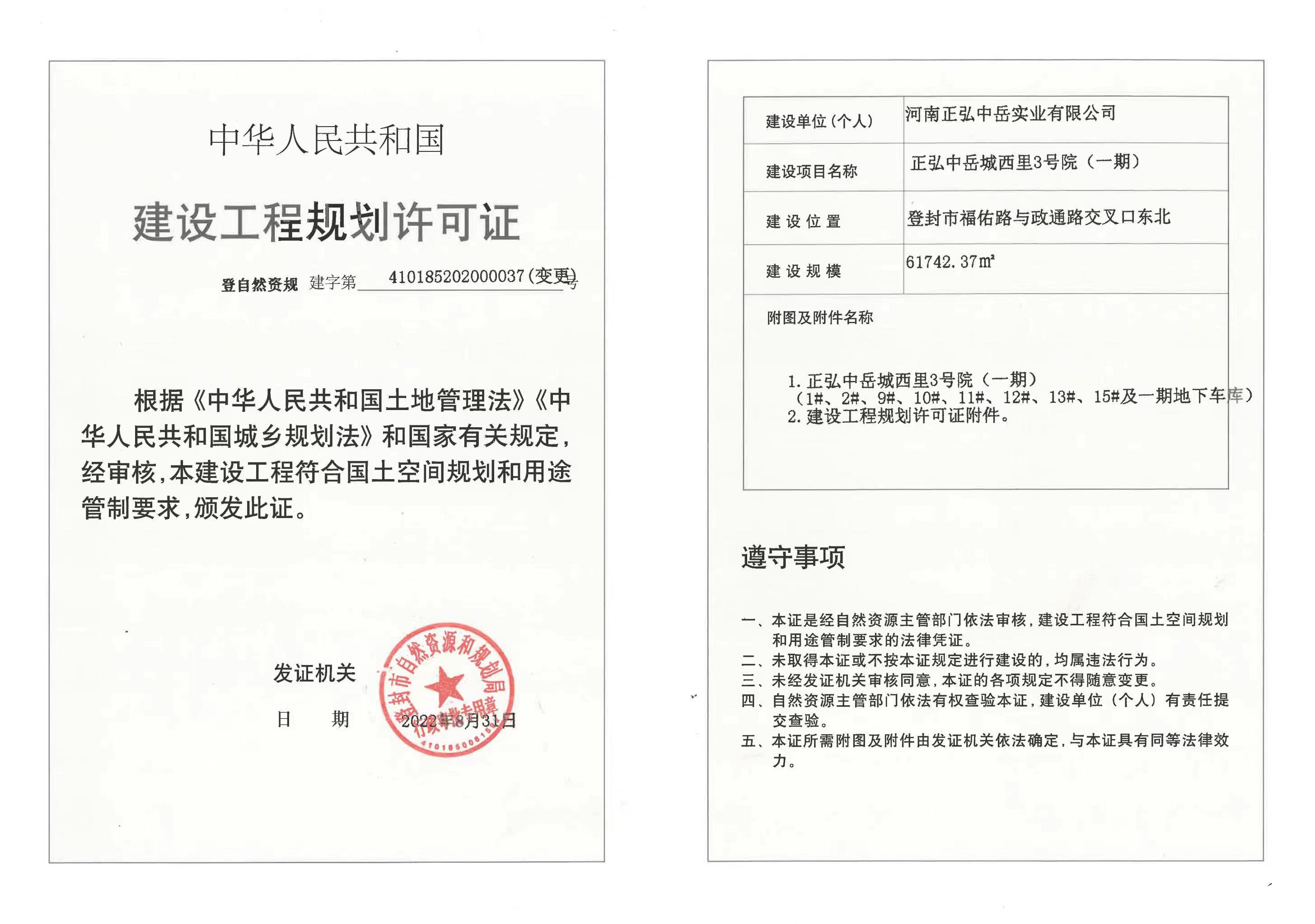 登封市自然资源和规划局关于正弘中岳城西里3号院(一期)项目建设工程规划许可证变更的证后公告