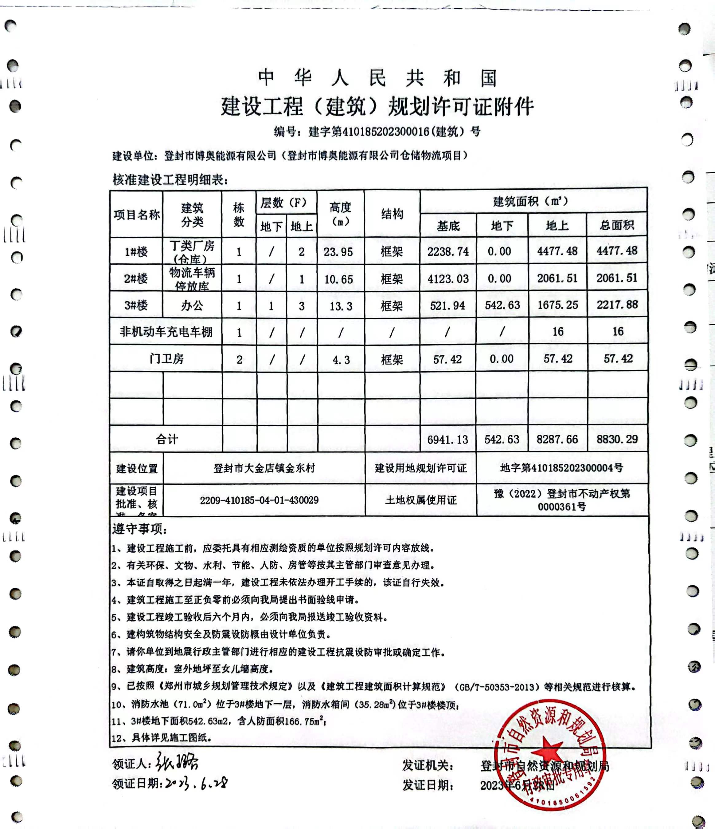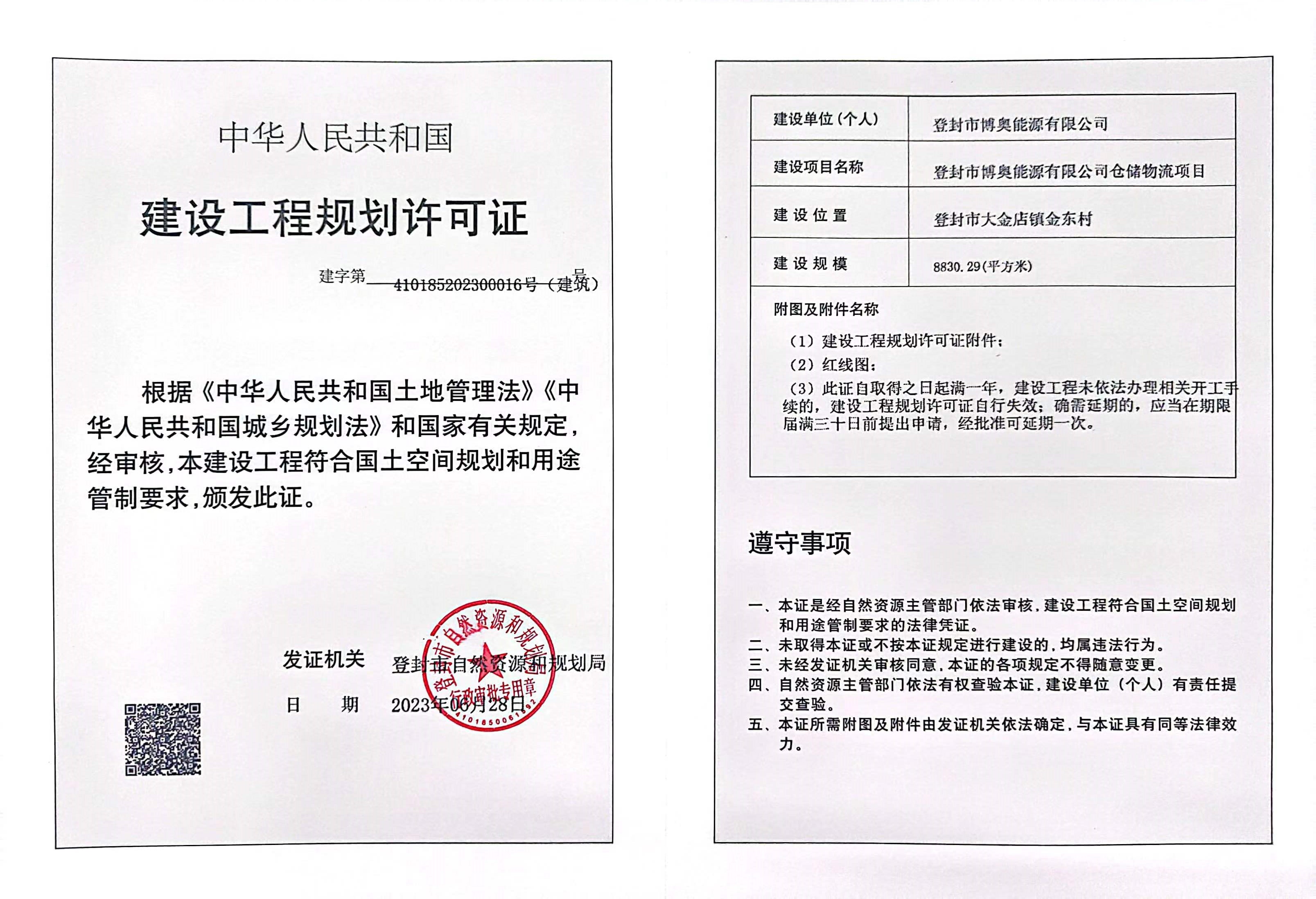 登封市自然资源和规划局关于登封市博奥能源有限公司仓储物流项目建设工程规划许可证证后公告