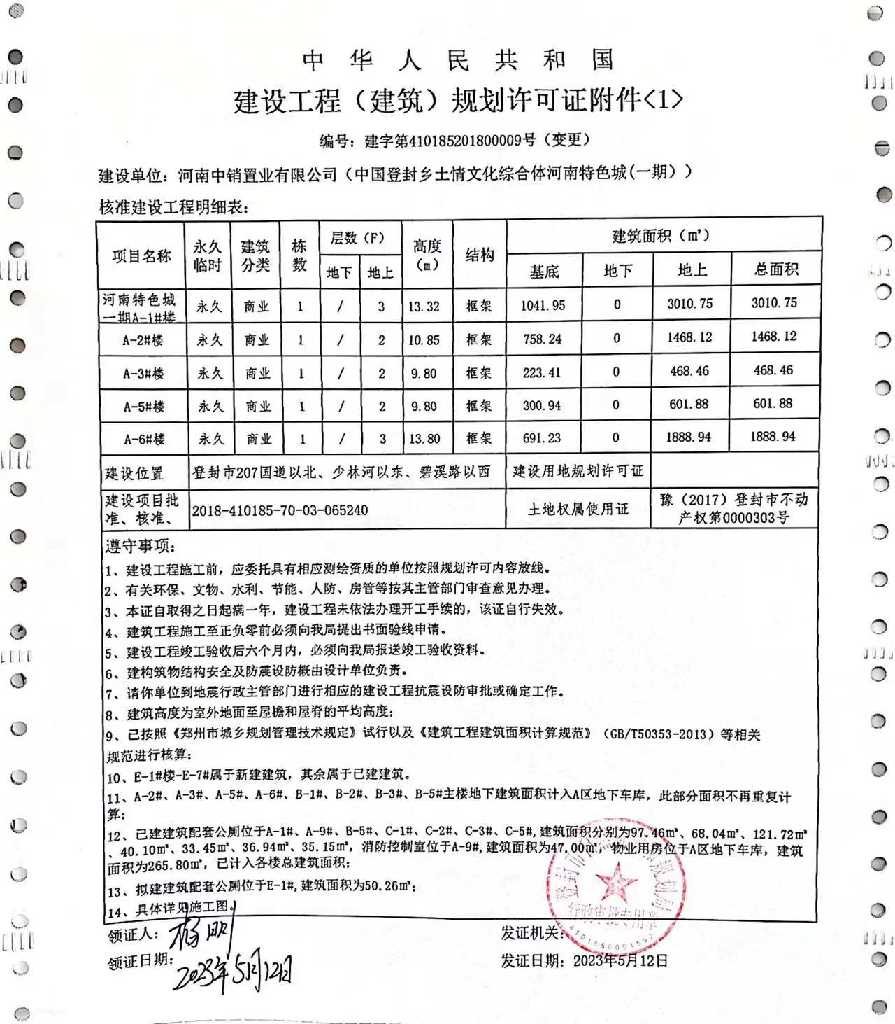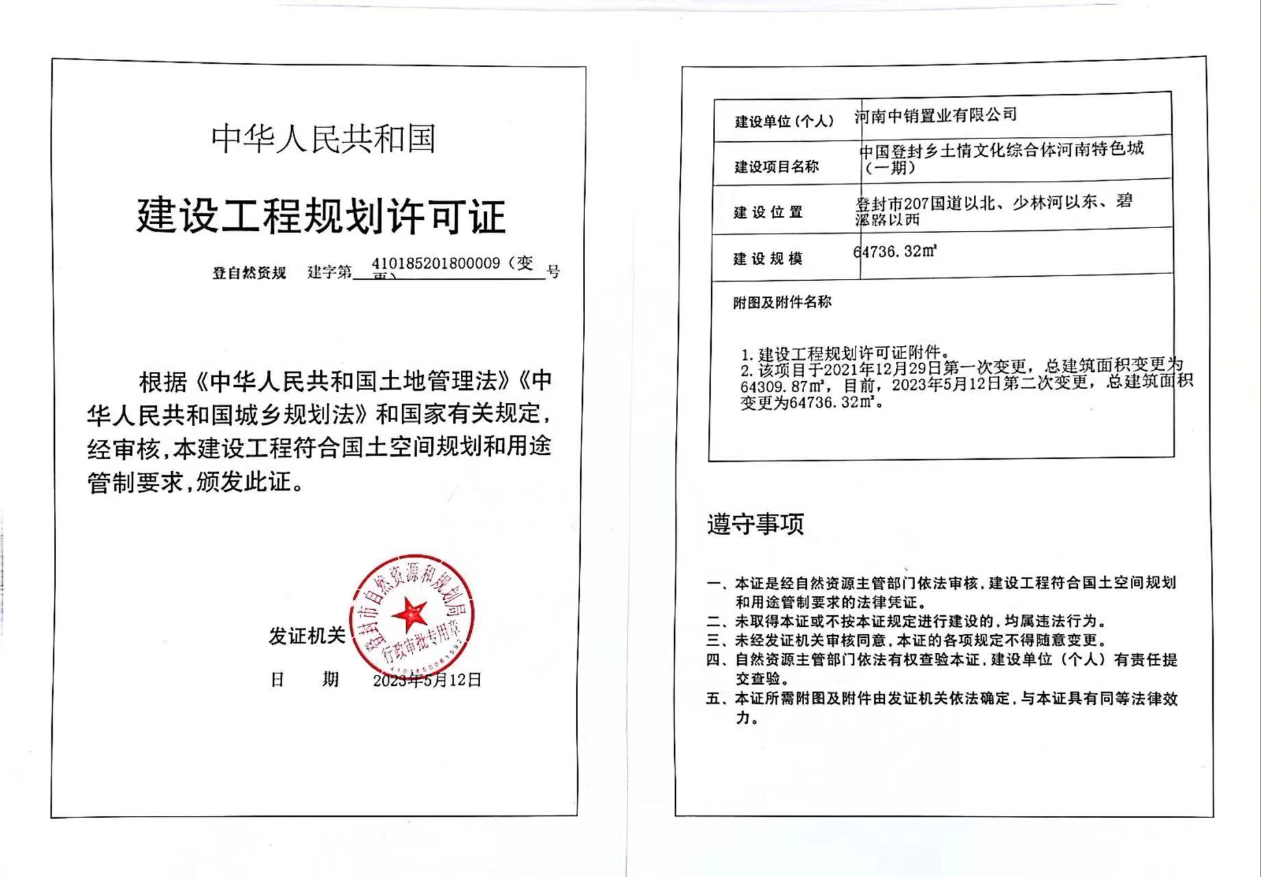登封市自然资源和规划局关于中国登封乡土情综合体河南特色城(一期)建设工程规划许可证变更的证后公告