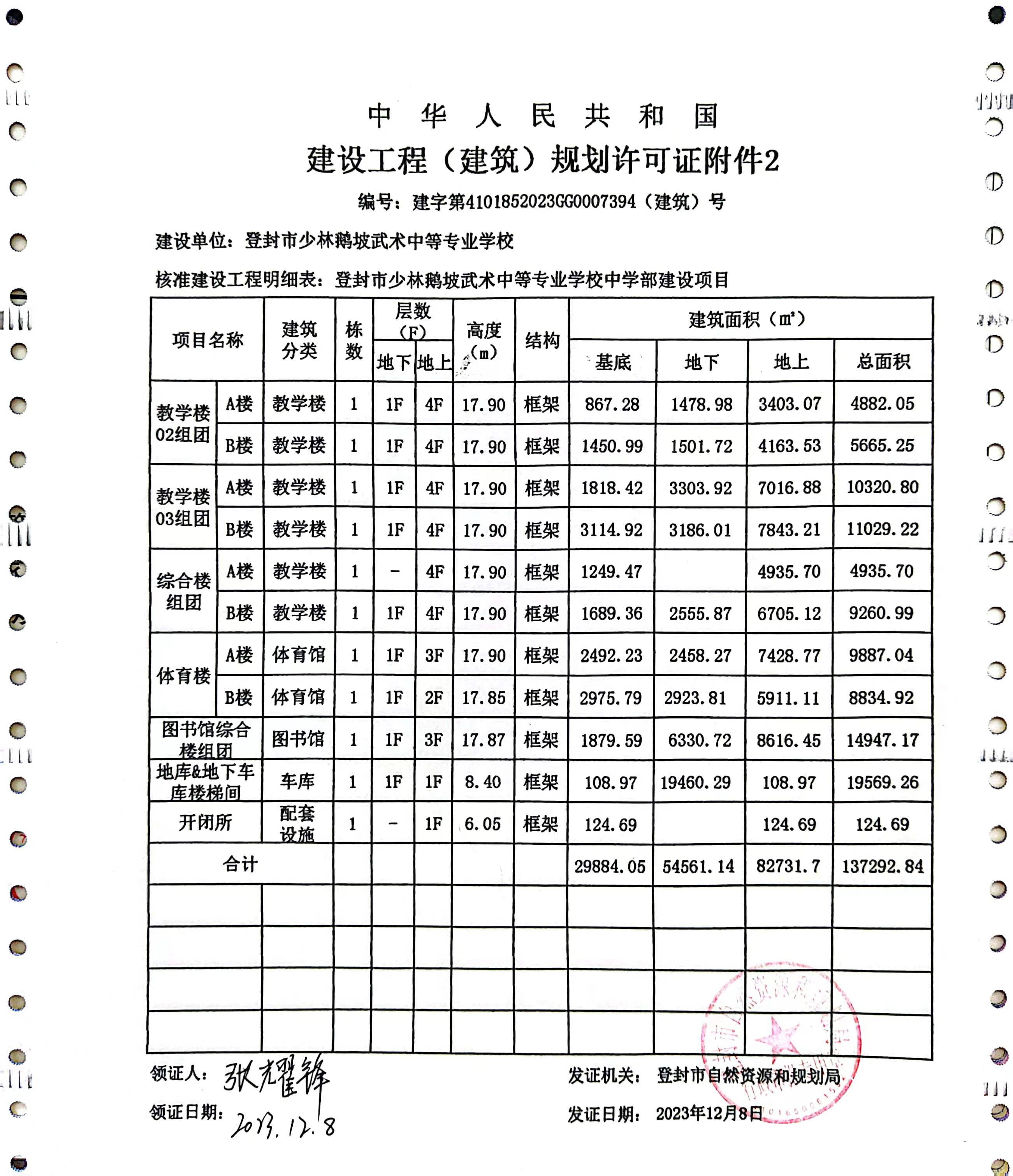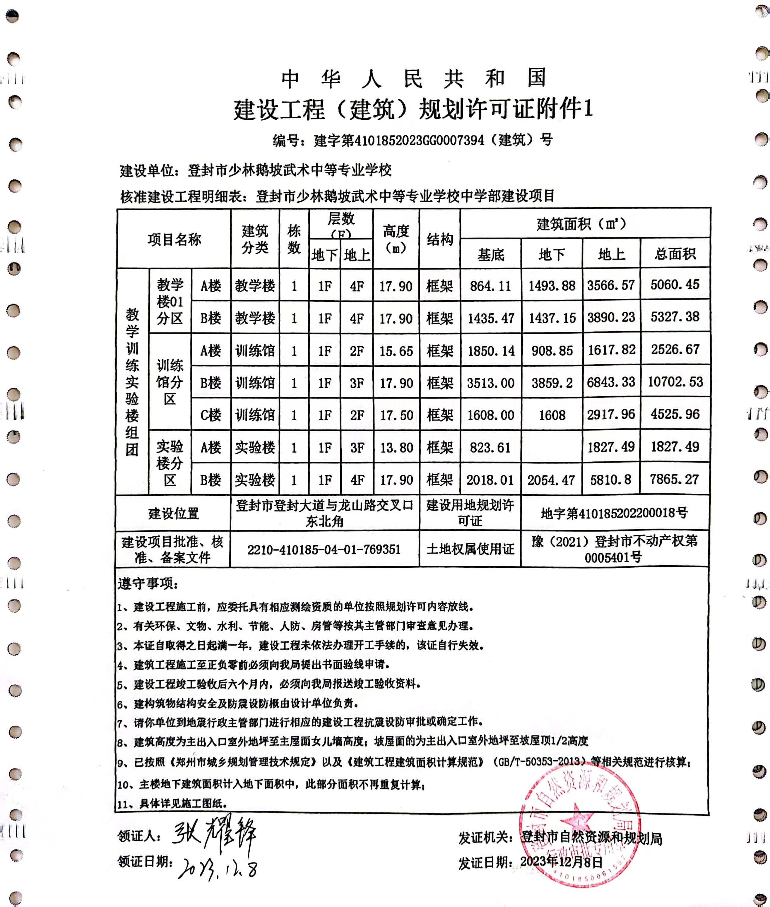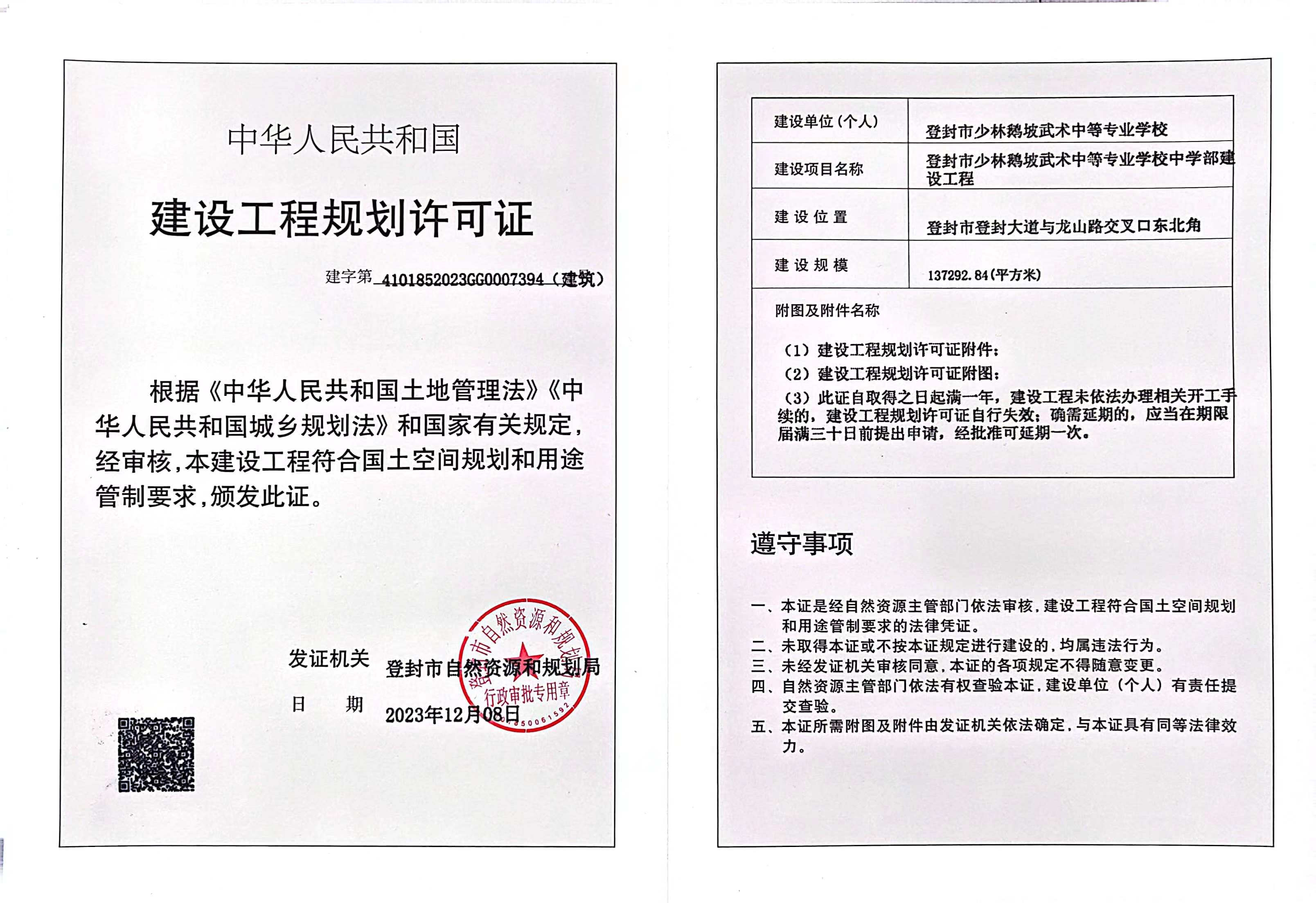 登封市自然资源和规划局关于登封市少林鹅坡武术中等专业学校中学部建设工程建设工程规划许可证证后公告