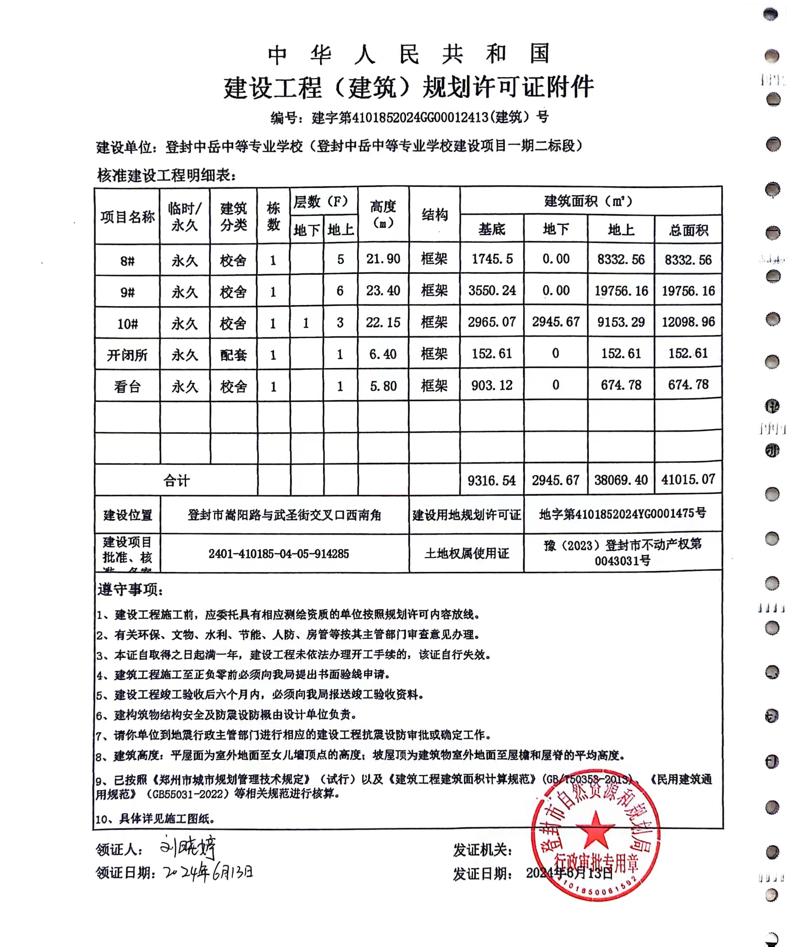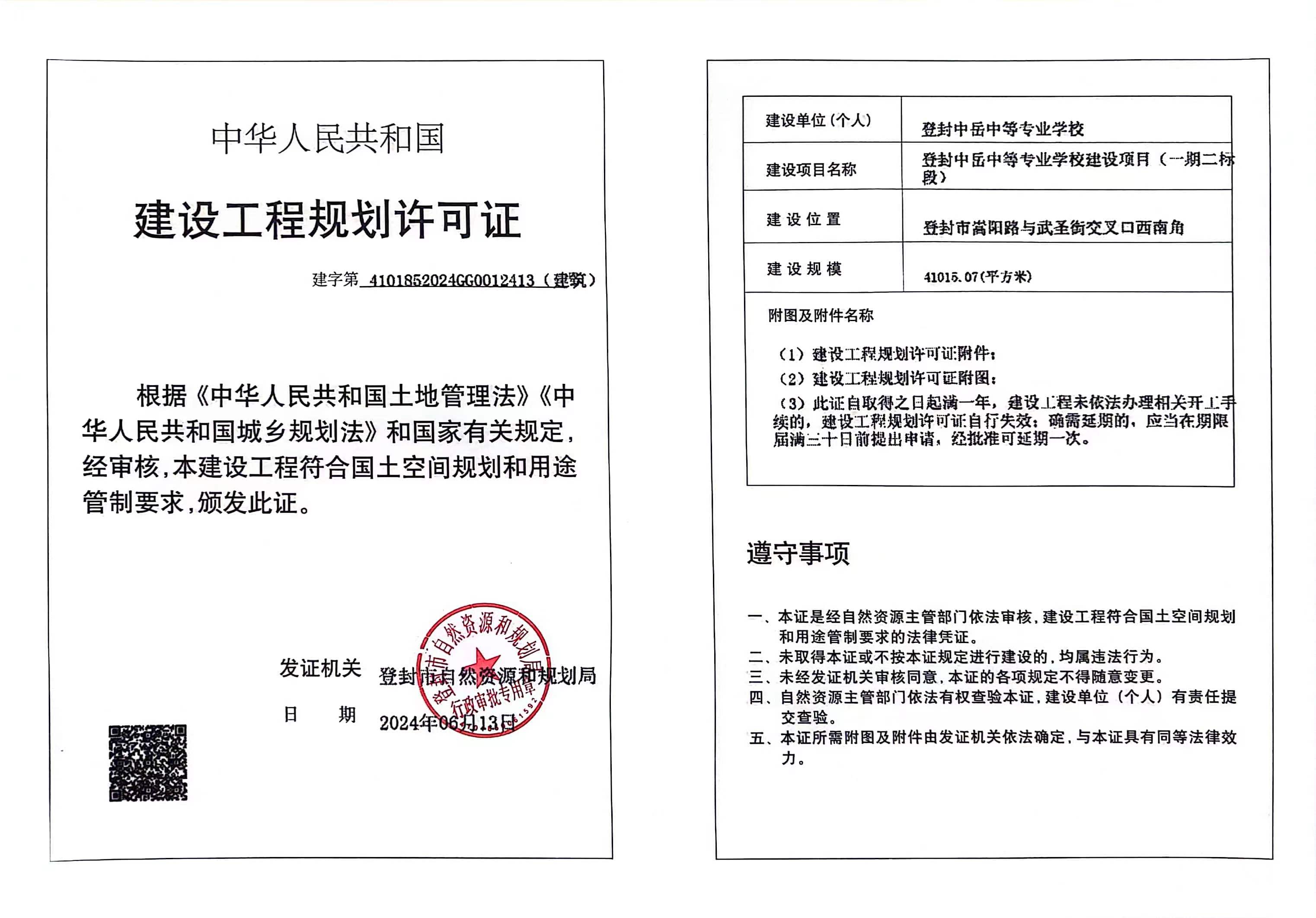 登封市自然资源和规划局关于登封中岳中等专业学校建设项目一期二标段建设工程规划许可证证后公告