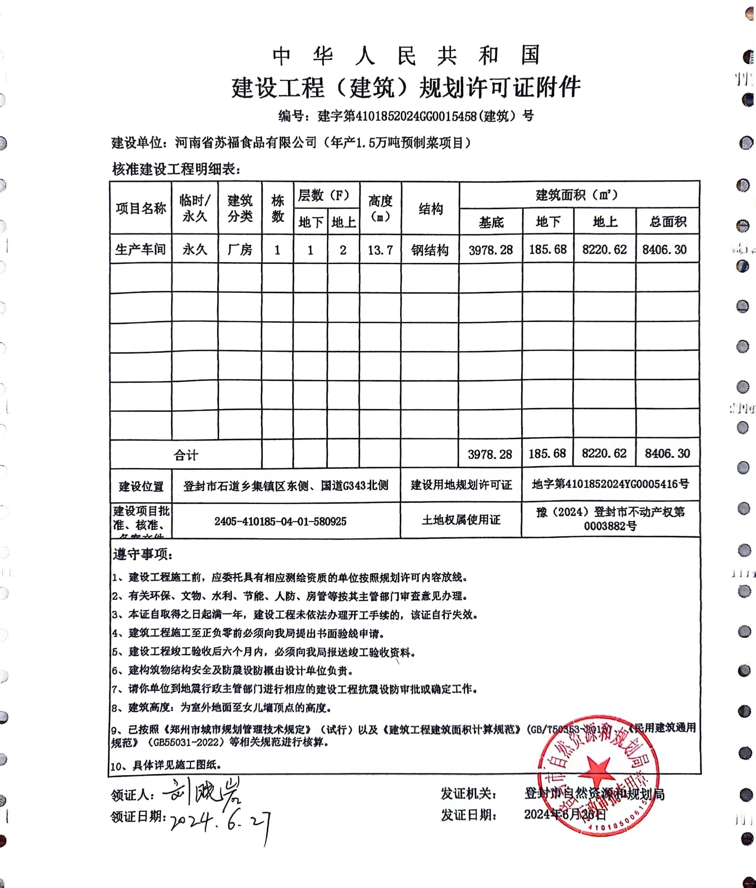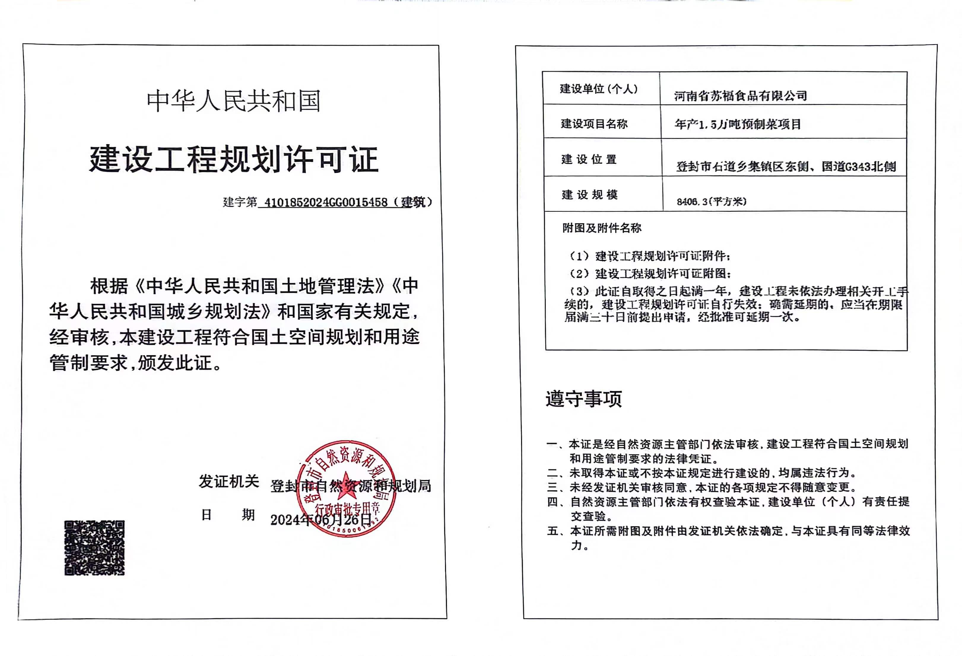 登封市自然资源和规划局关于年产1.5万吨预制菜项目建设工程规划许可证证后公告