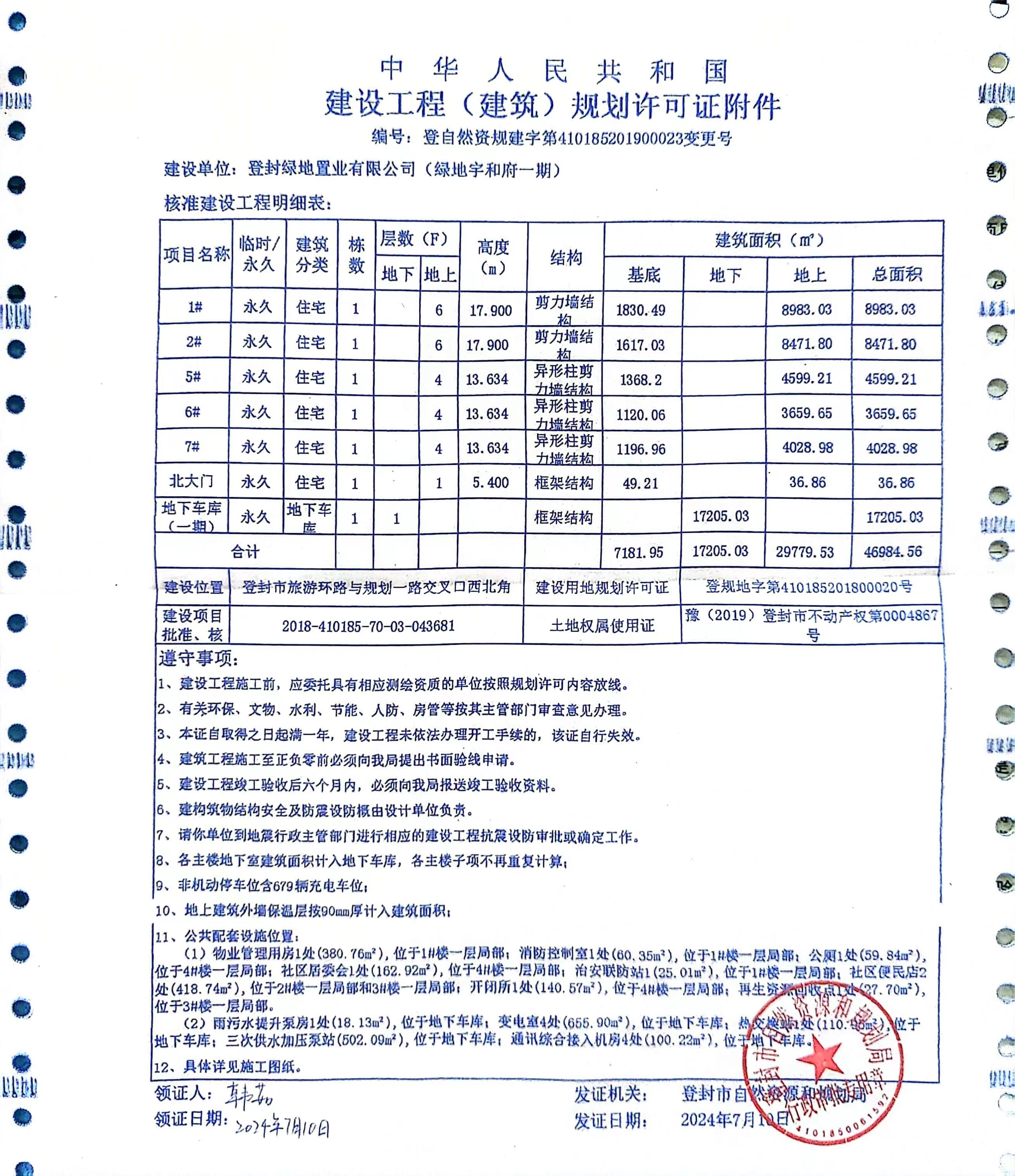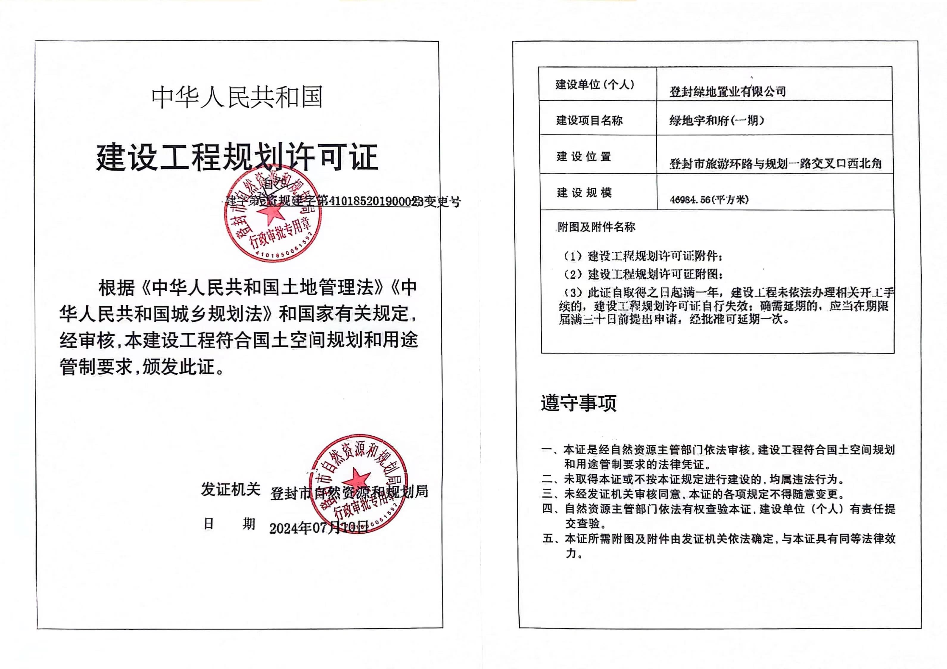 登封市自然资源和规划局关于绿地宇和府一期建设工程规划许可证变更证后公告