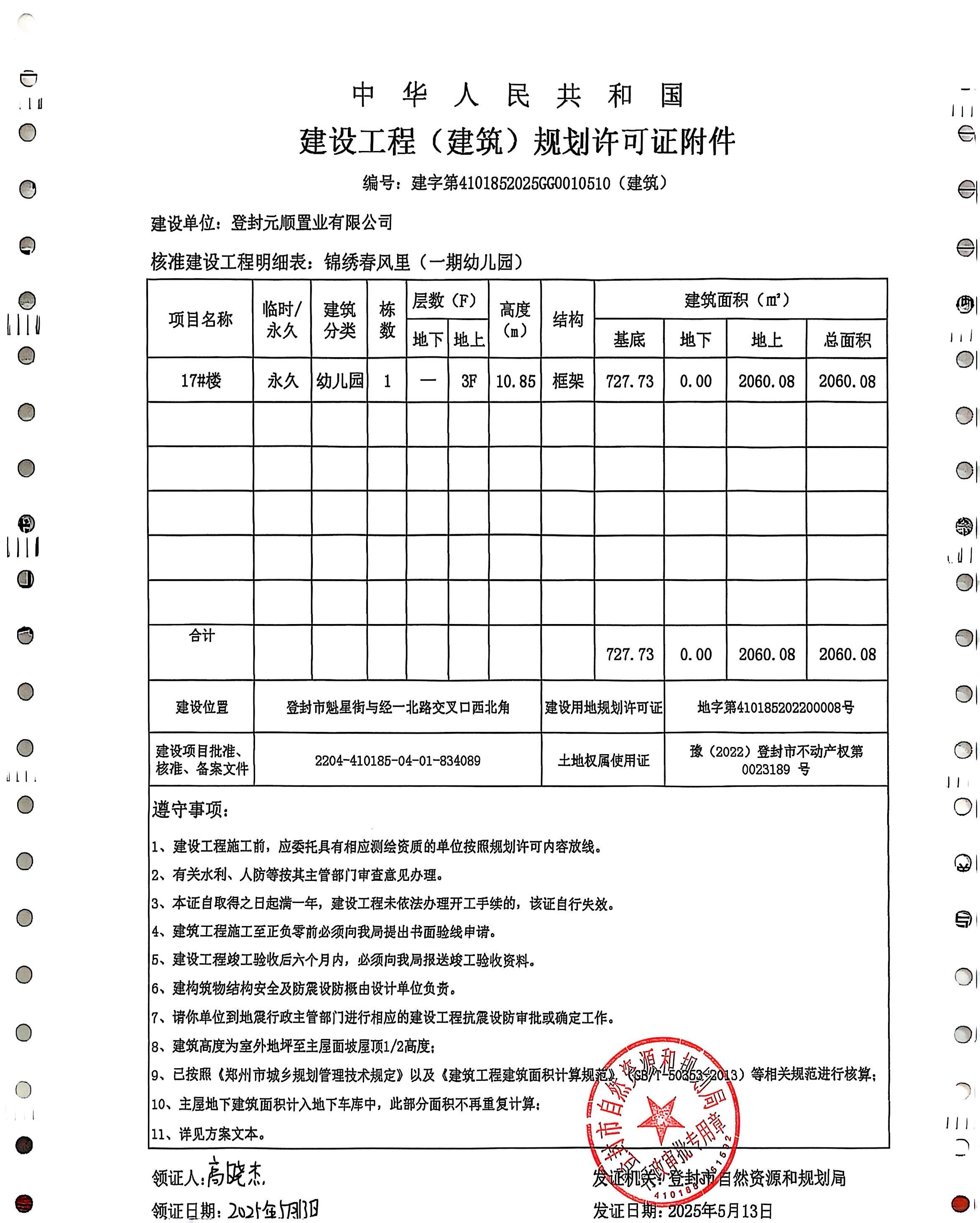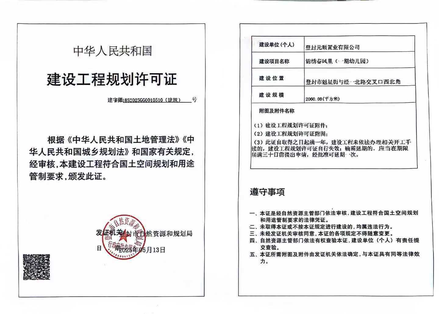 登封市自然资源和规划局关于锦绣春风里(一期幼儿园)建设工程规划许可证的证后公告