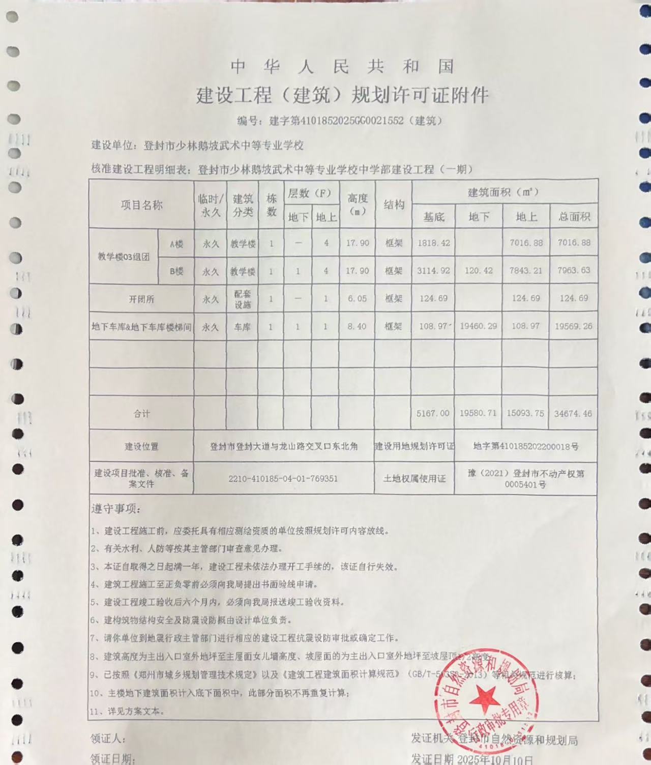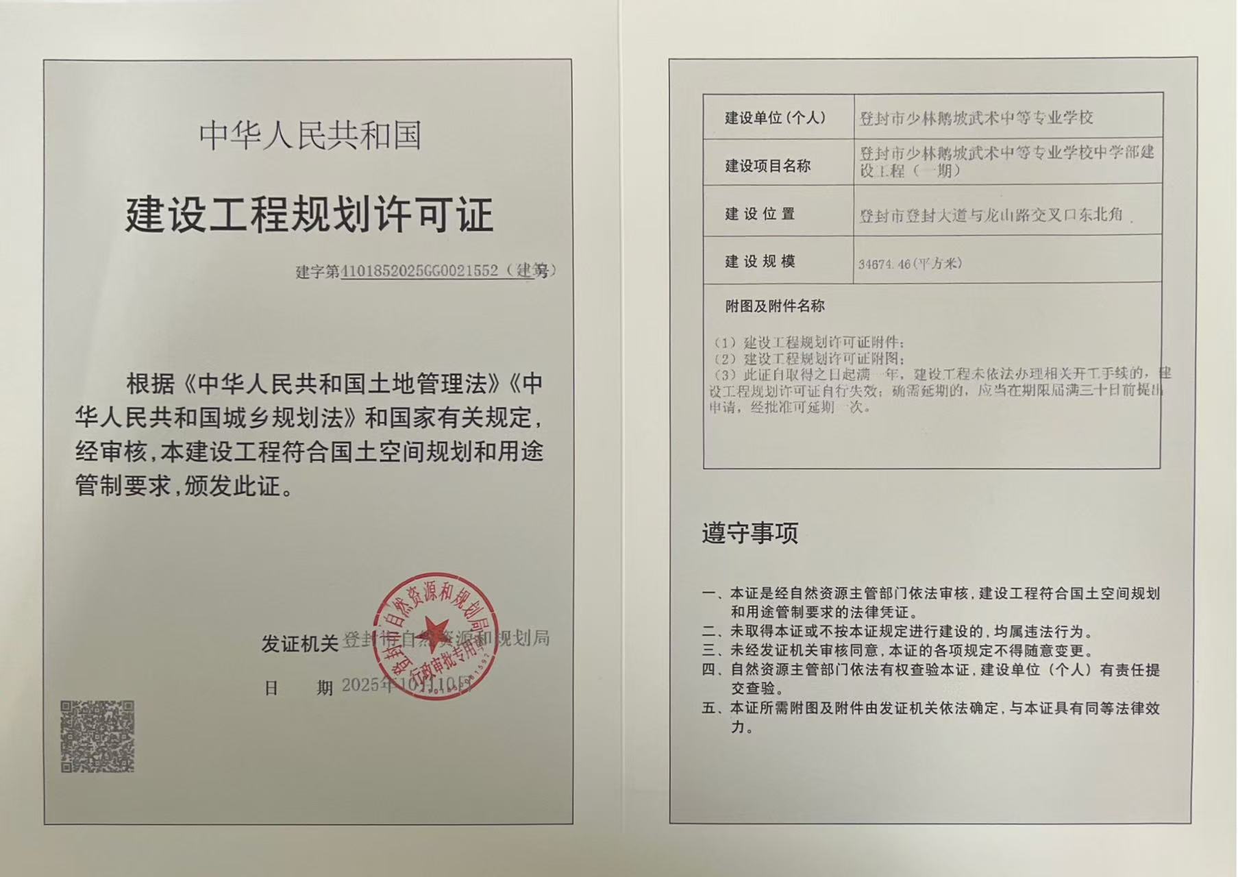 登封市自然资源和规划局关于登封市少林鹅坡武术中等专业学校中学部建设工程(一期)建设工程规划许可证证后公告