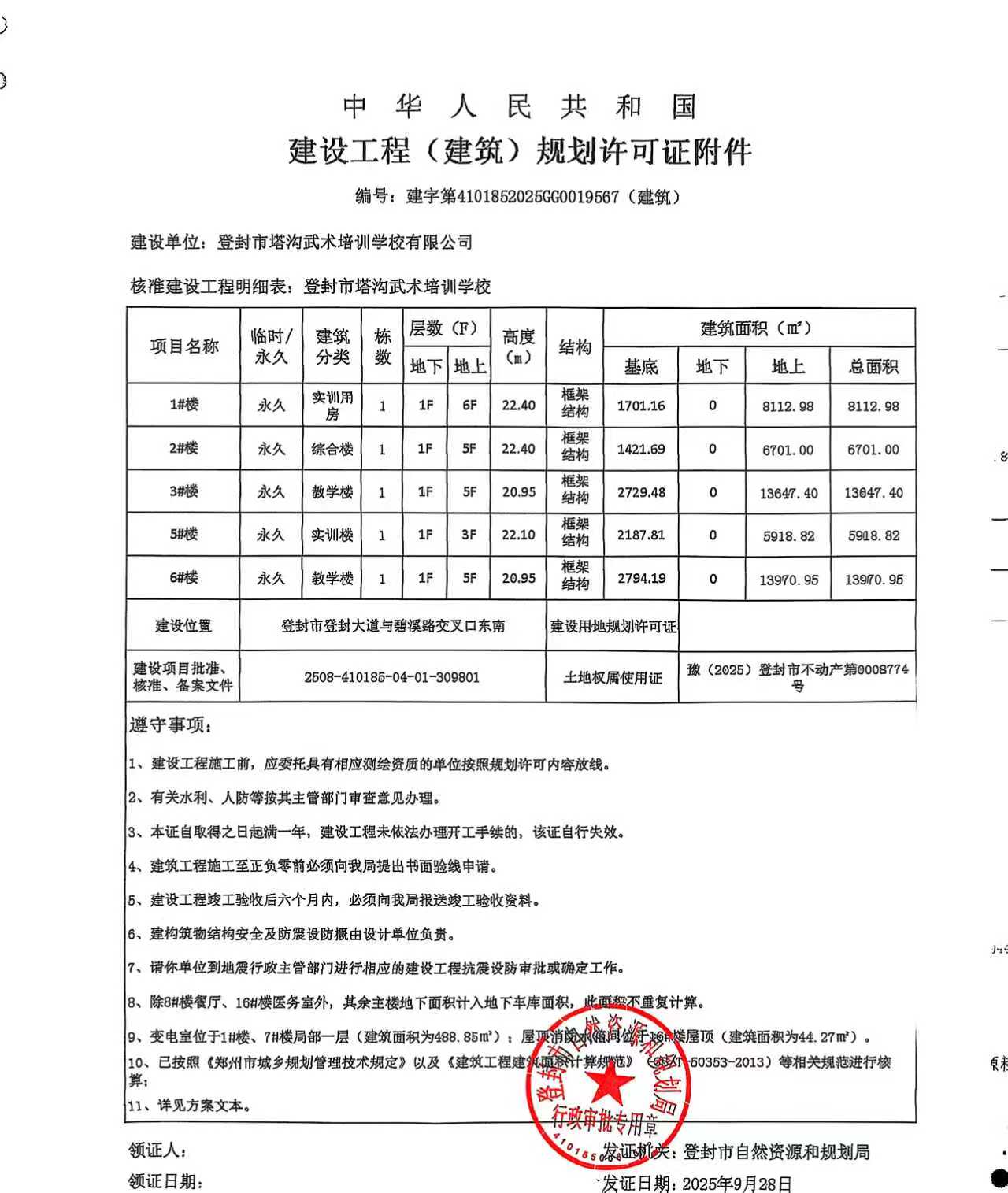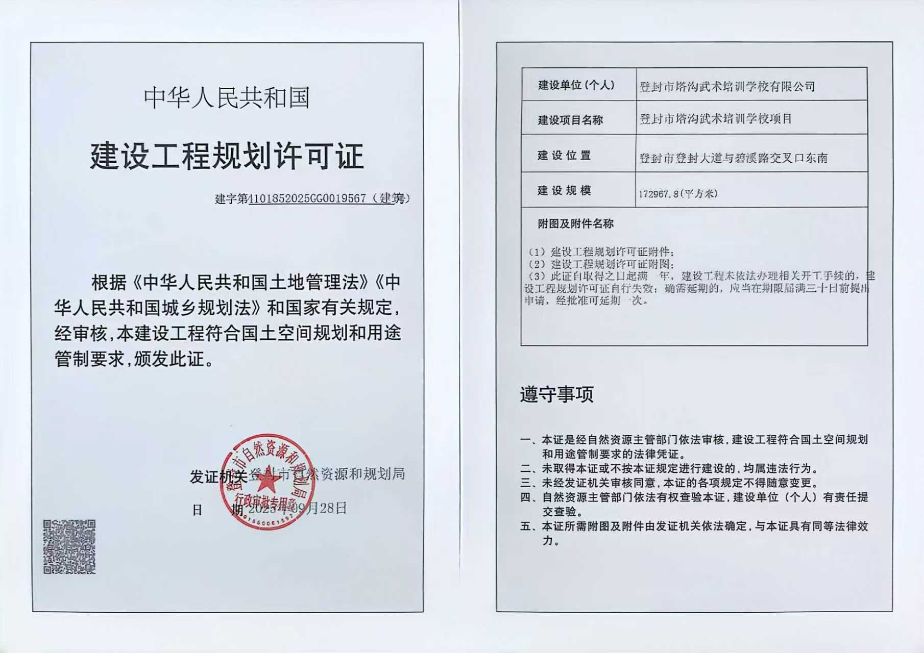 登封市自然资源和规划局关于登封市塔沟武术培训学校项目建设工程规划许可证证后公告