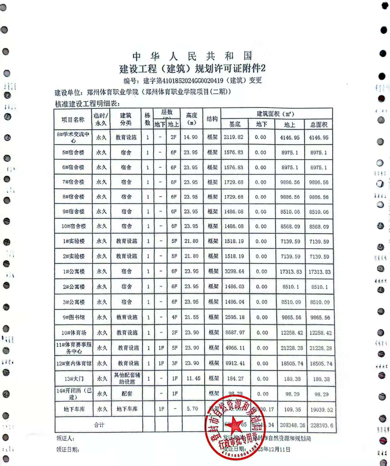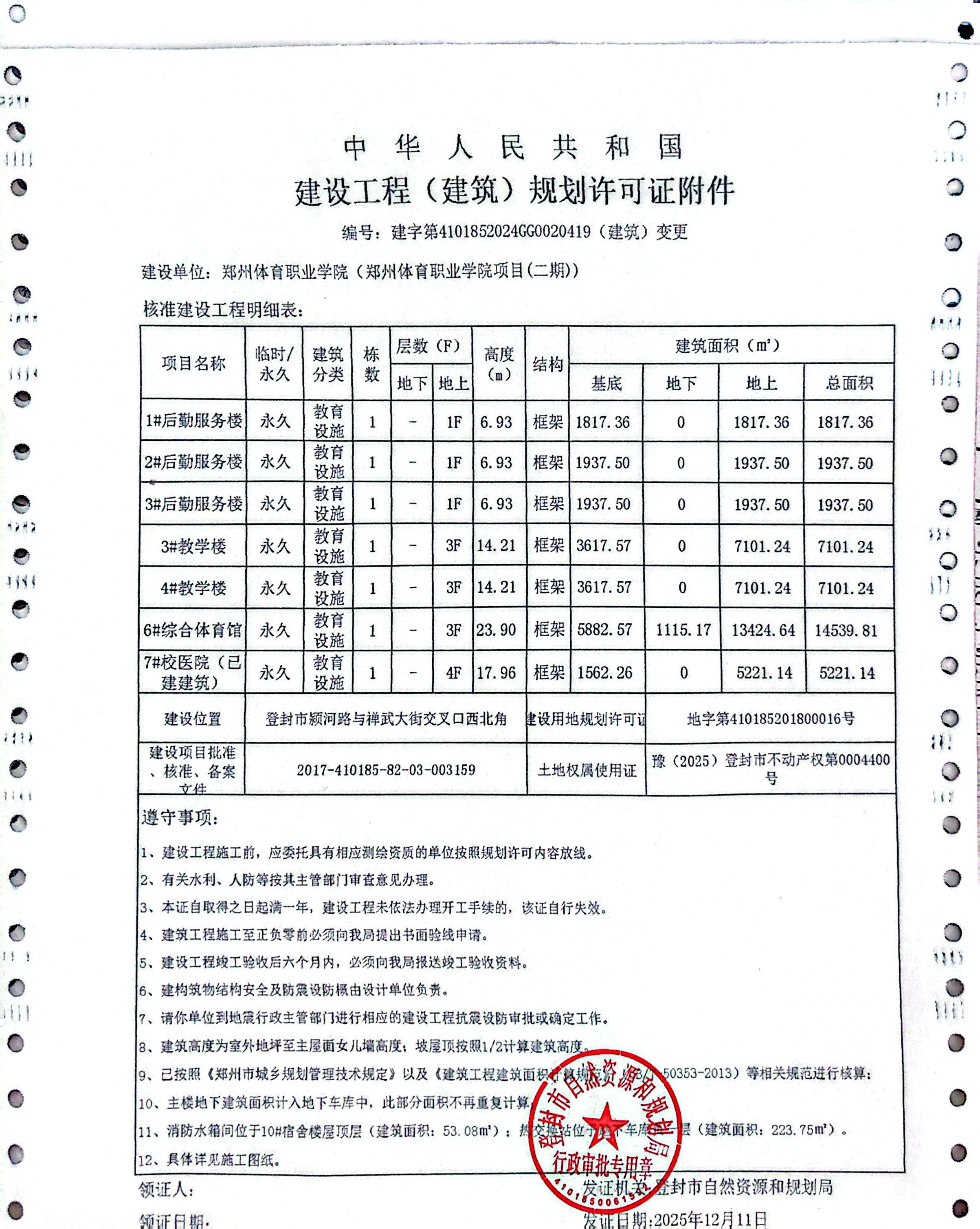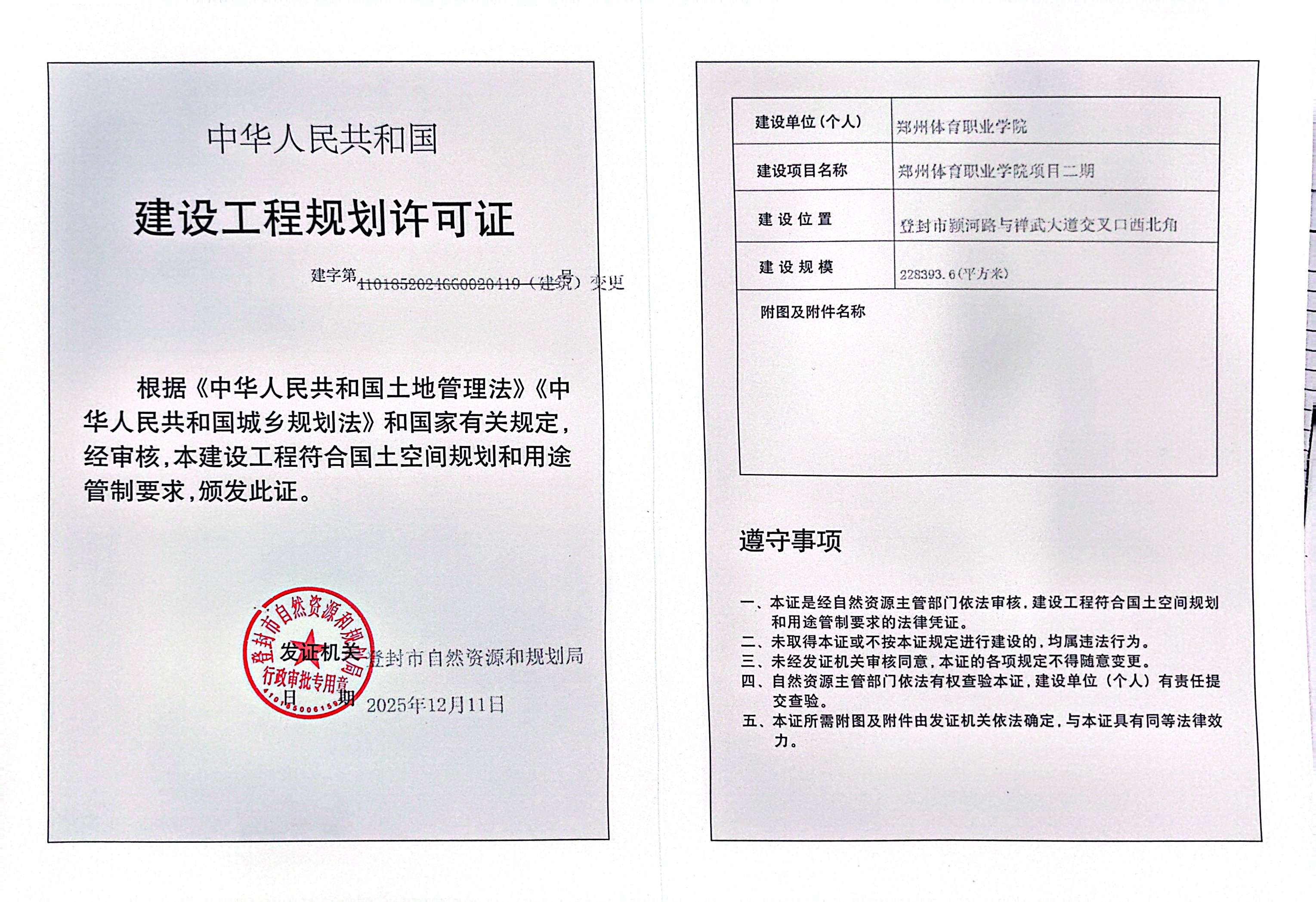 登封市自然资源和规划局关于郑州体育职业学院项目(二期)建设工程规划许可证变更证后公告
