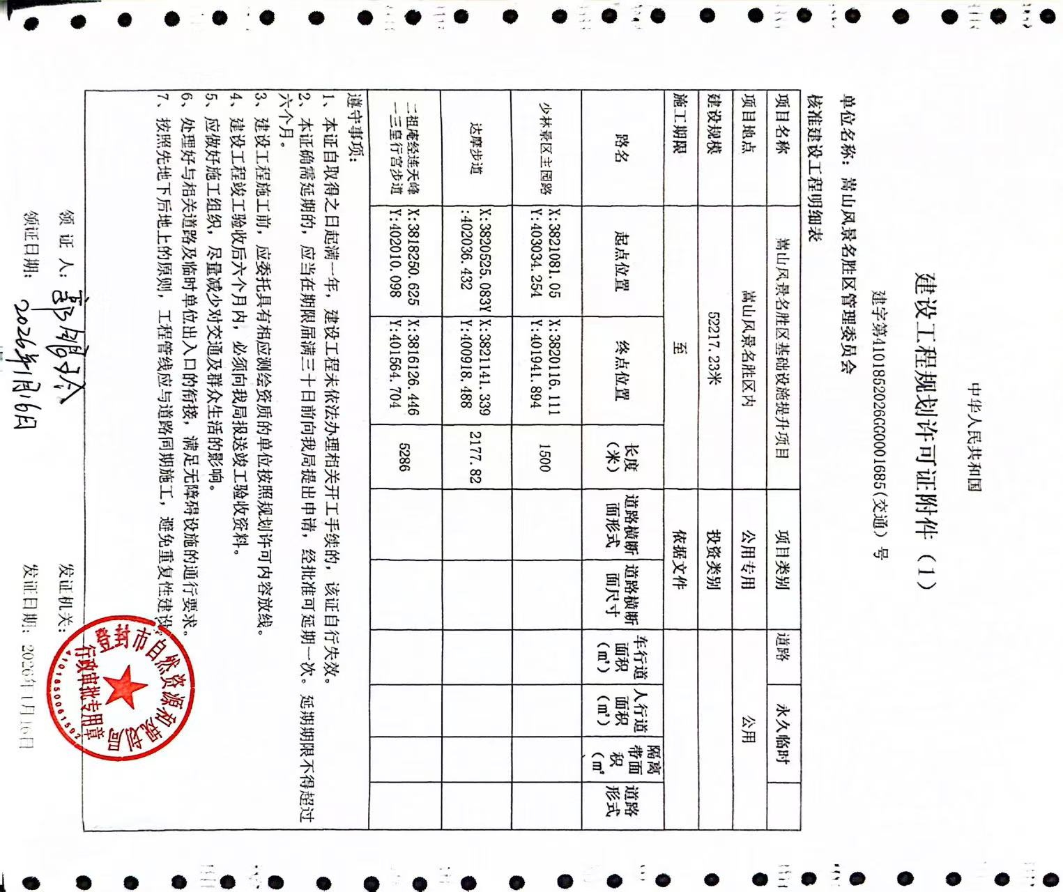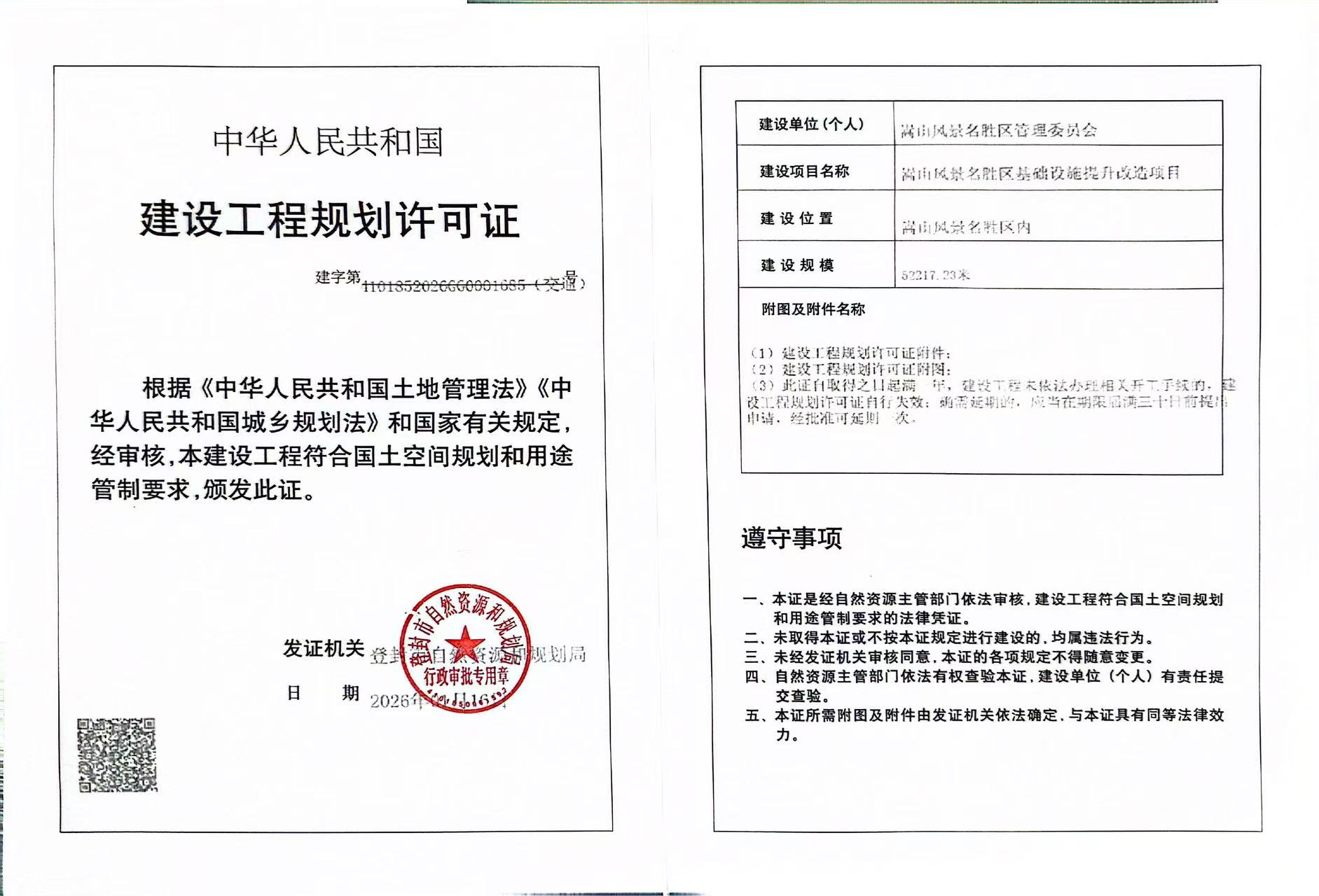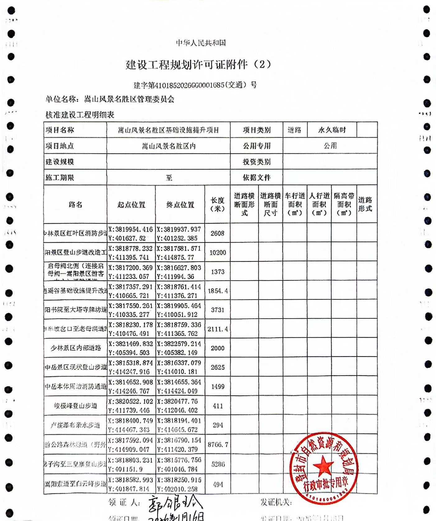 登封市自然资源和规划局关于嵩山风景名胜区基础设施提升改造项目建设工程规划许可证证后公告