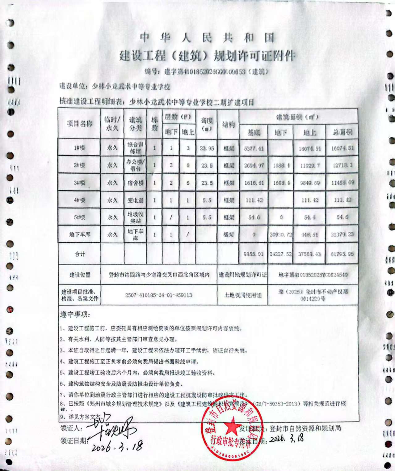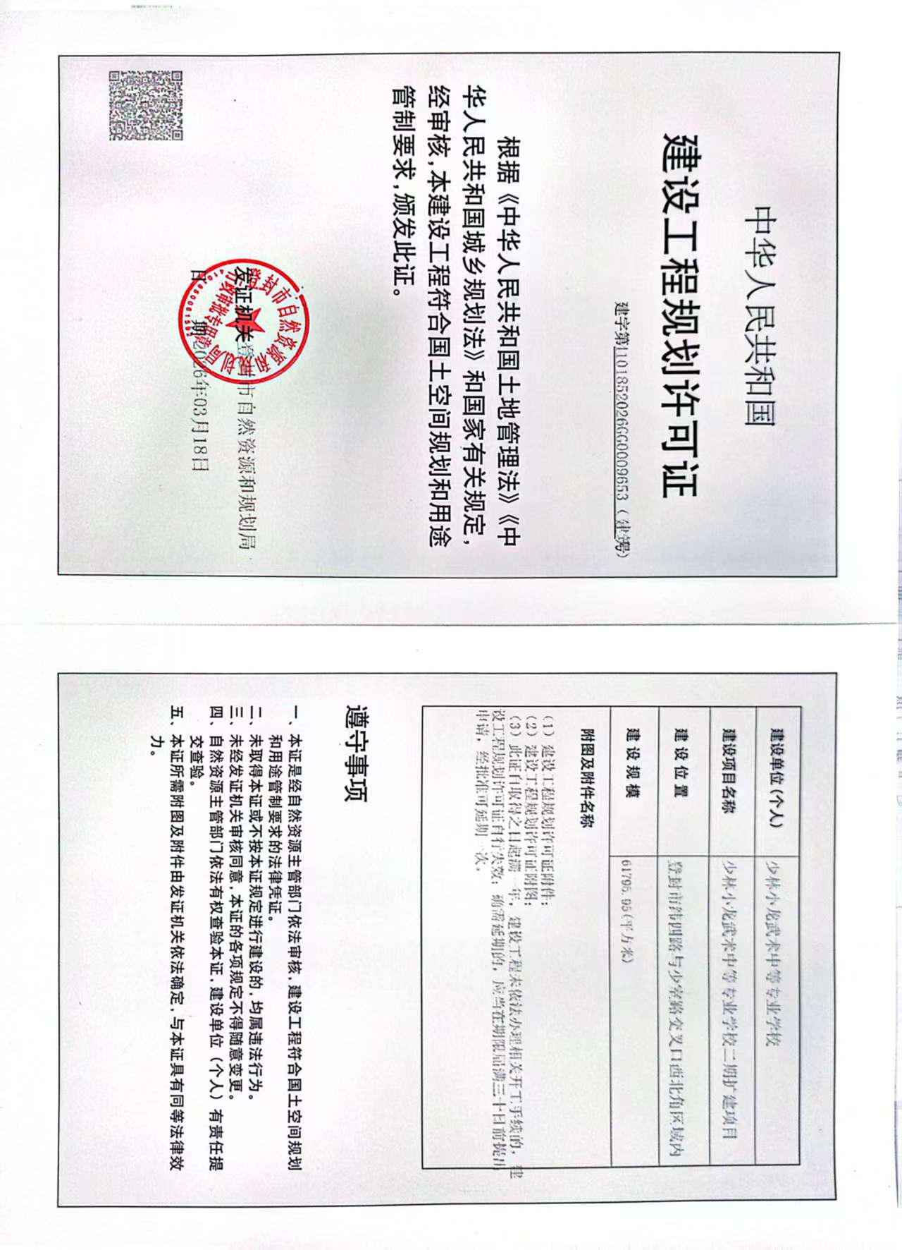 登封市自然资源和规划局关于少林小龙武术中等专业学校二期扩建项目建设工程规划许可证证后公告
