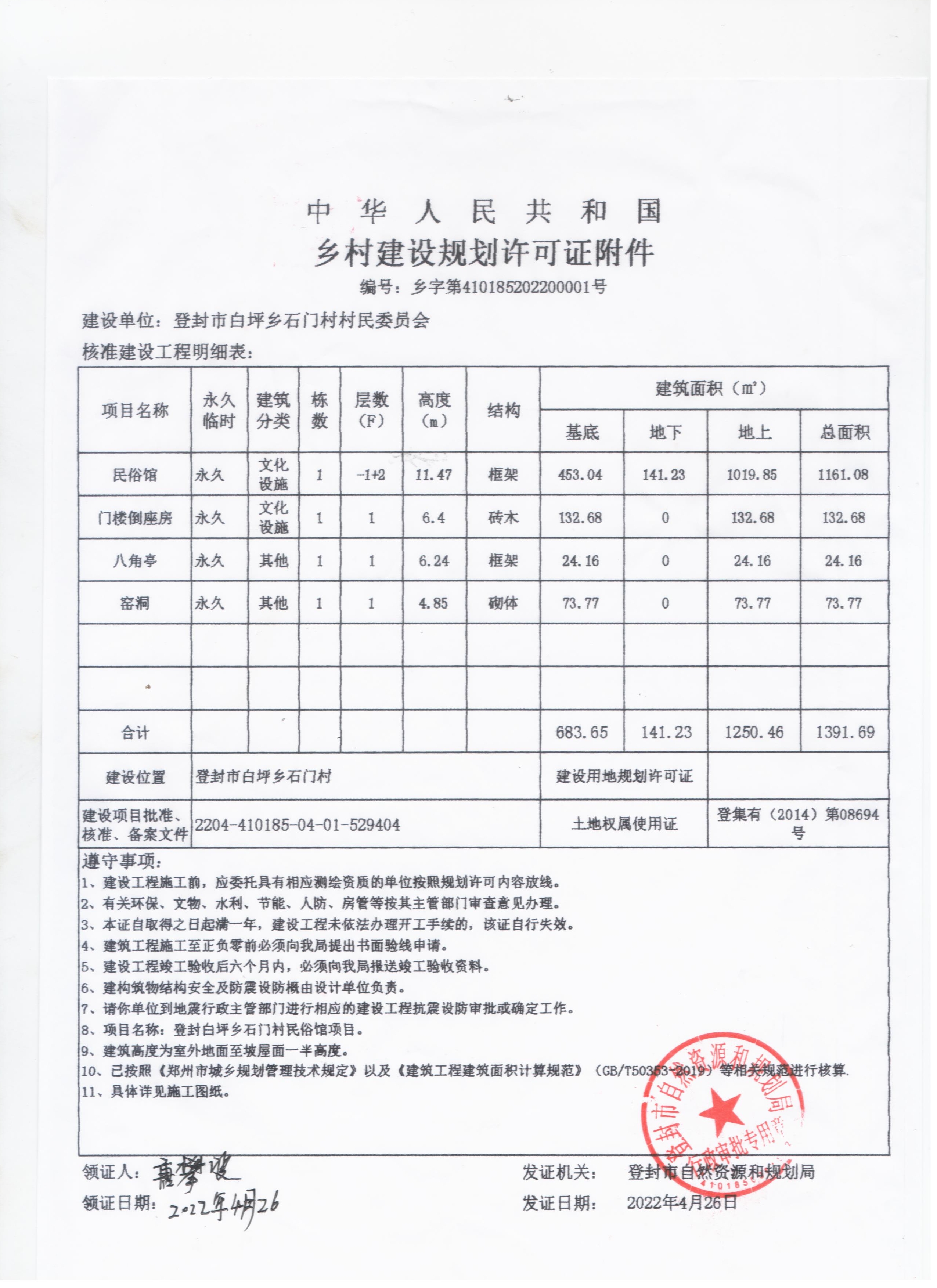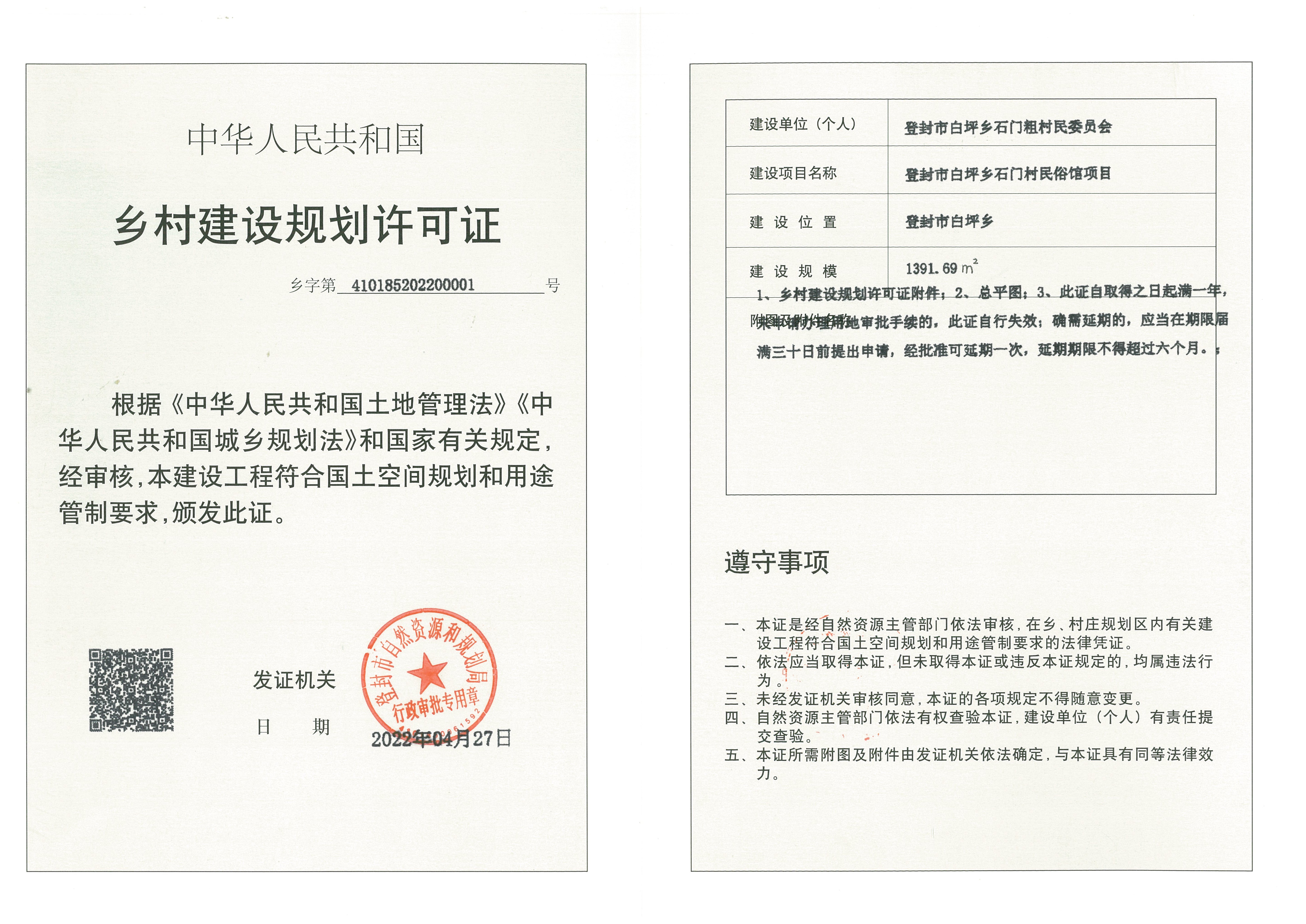登封市自然资源和规划局关于登封市白坪乡石门村民俗馆项目乡村规划许可证的公示